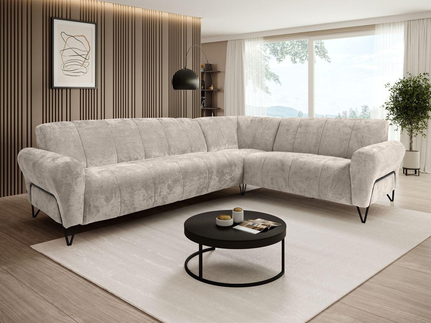 Das Ecksofa VOLARE verbindet modernes Design mit höchstem Sitzkomfort und ist die perfekte Wahl für stilbewusste Wohnzimmer. Die eleganten Metallbeine in Schwarz verleihen dem Sofa einen edlen, zeitlosen Charakter, der sich nahtlos in verschiedene Einrichtungskonzepte einfügt. Der hochwertige HR-Schaumstoff und die robuste B-Typ-Wellenfederung sorgen für optimalen Sitzkomfort und Langlebigkeit – ideal für entspannte Stunden in Ihrem Zuhause.