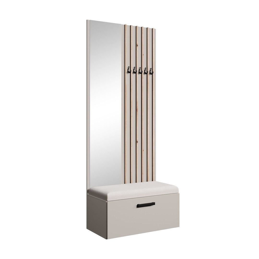 Elegante Garderobe MARGARET II mit Schuhschrank, Lamellen und Spiegel ist die perfekte Lösung für jeden Flur. Mit einer Breite von 81 cm bietet sie optimale Organisation, indem sie Platz für Schuhe, Oberbekleidung und Accessoires schafft. Dank der eleganten Lamellen und praktischen Haken kannst du Jacken, Mäntel oder Taschen bequem aufbewahren, während der große Spiegel nicht nur bei der täglichen Vorbereitung hilft, sondern den Raum auch optisch vergrößert.