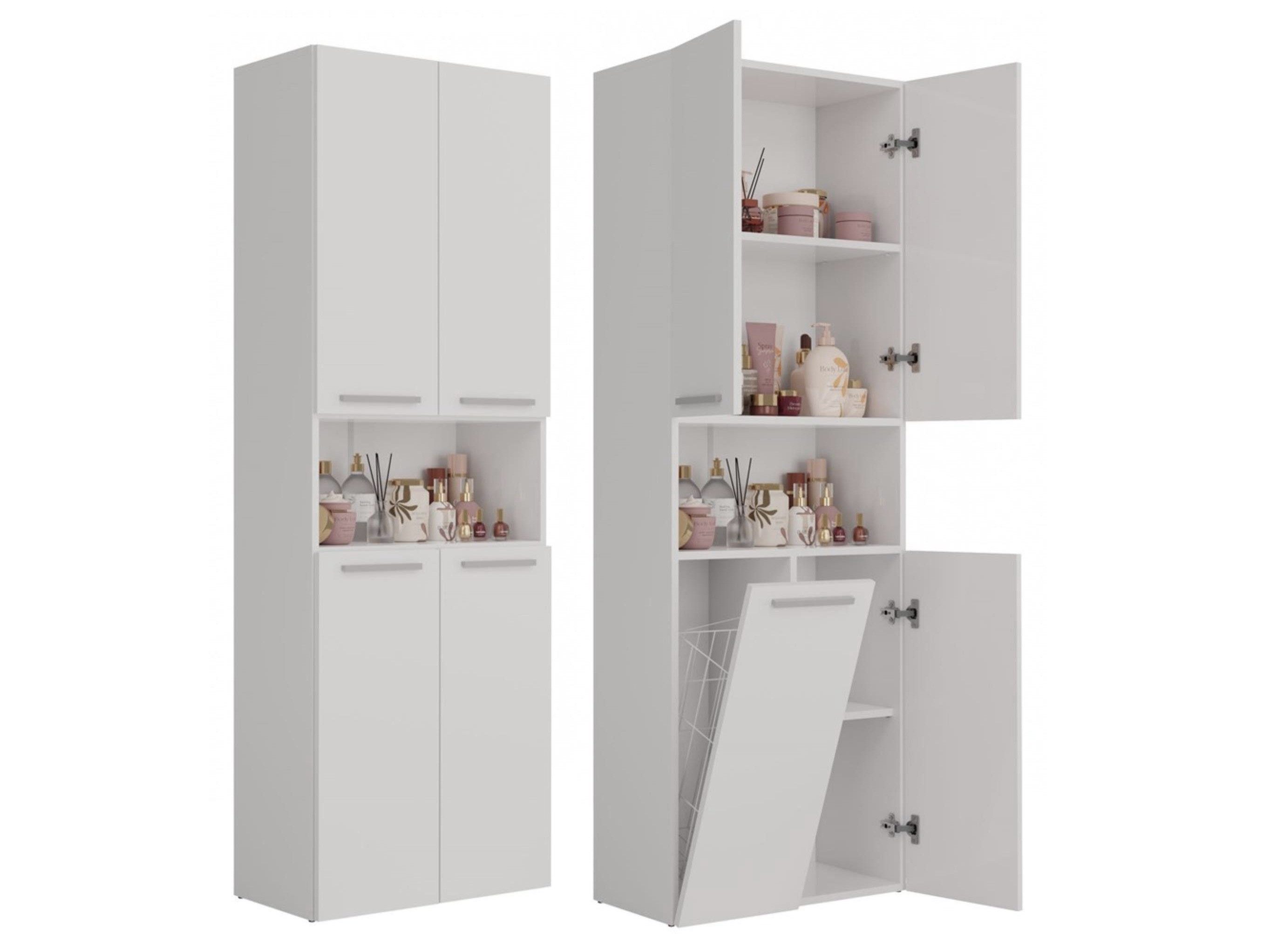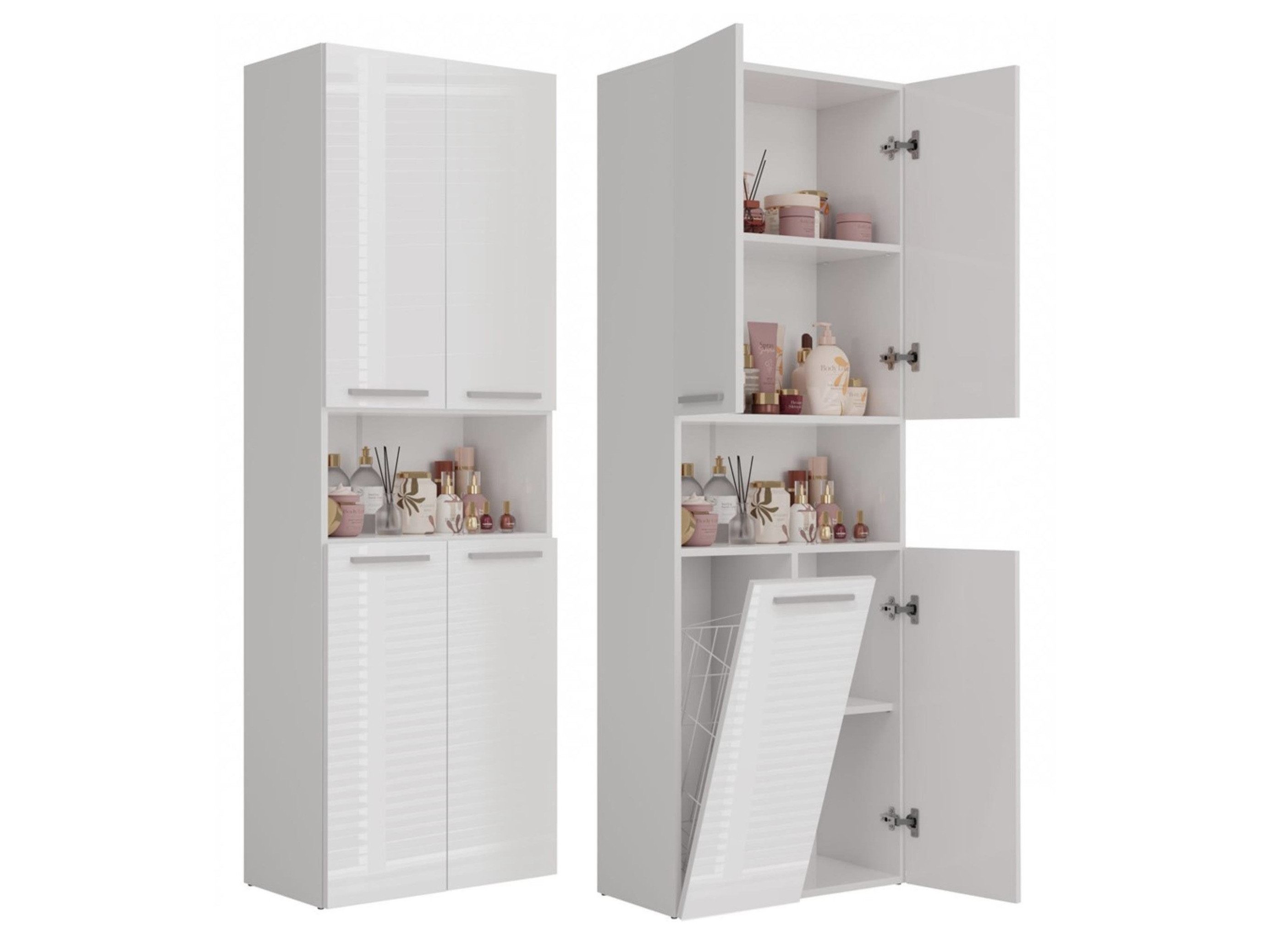 Fünf Fachböden, von denen eines offen ist, bieten vielfältige Aufbewahrungsmöglichkeiten. Auf den oberen Regalen können Sie Kosmetika, Handtücher und andere Kleinigkeiten platzieren, während das offene Regal der perfekte Ort für dekorative Kosmetika oder Gegenstände ist, die Sie immer griffbereit haben möchten. Darüber hinaus ist der untere Teil des Schrankes mit einem praktischen Wäschekorb ausgestattet, der es einfacher macht, schmutzige Wäsche sauber zu halten und zu trennen.