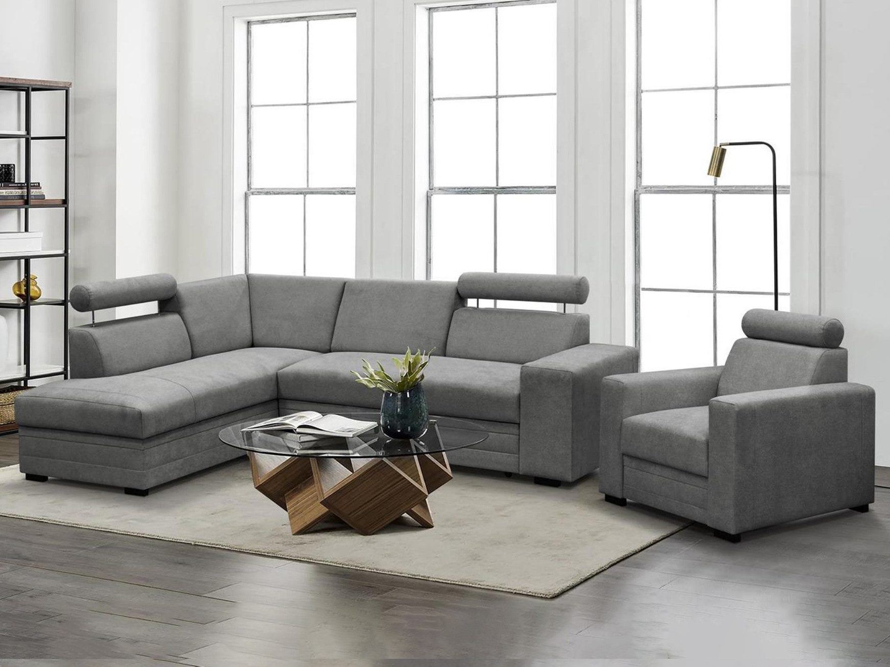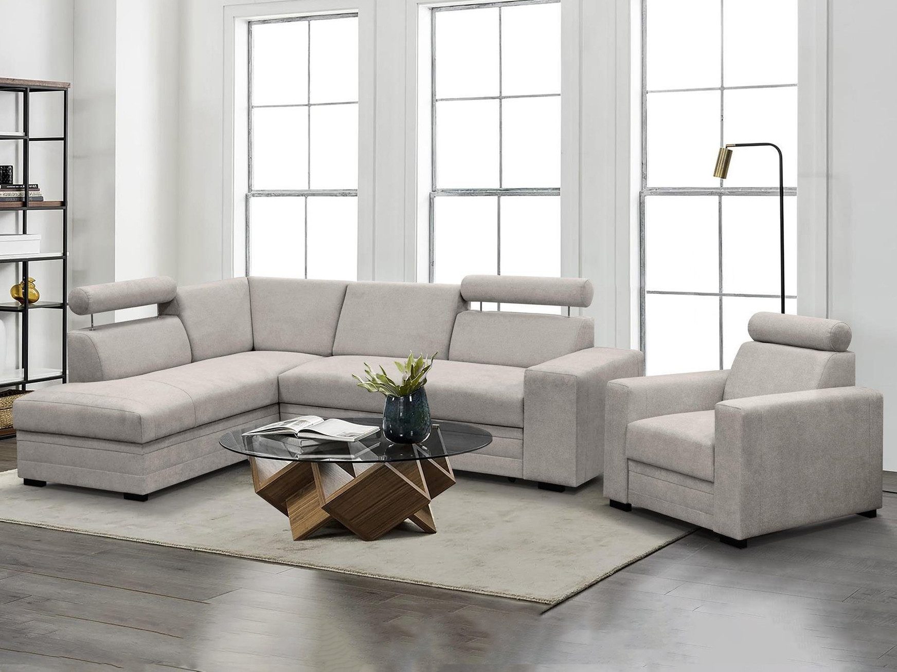 Unser Ecksofa zeichnet sich durch eine solide Konstruktion und einen bequemen Sitz auf der bonel-Feder aus. Darüber hinaus verfügt das Sofa über eine Schlaffunktion, die mit einem Delfinautomaten ausgeklappt werden kann, einen Bettkasten unter der Ottomane und verstellbare Kopfstützen. Zu diesem Set gehört unser passender Sessel, der ein ebenso komfortables Erlebnis garantiert. Ausgestattet mit einer Bonel-Feder im Sitz bietet der Sessel hervorragende Unterstützung und Elastizität. Die verstellbaren Kopfstützen ermöglichen es Ihnen, die Position an Ihre individuellen Vorlieben anzupassen und bieten eine hervorragende Unterstützung für Nacken und Kopf.