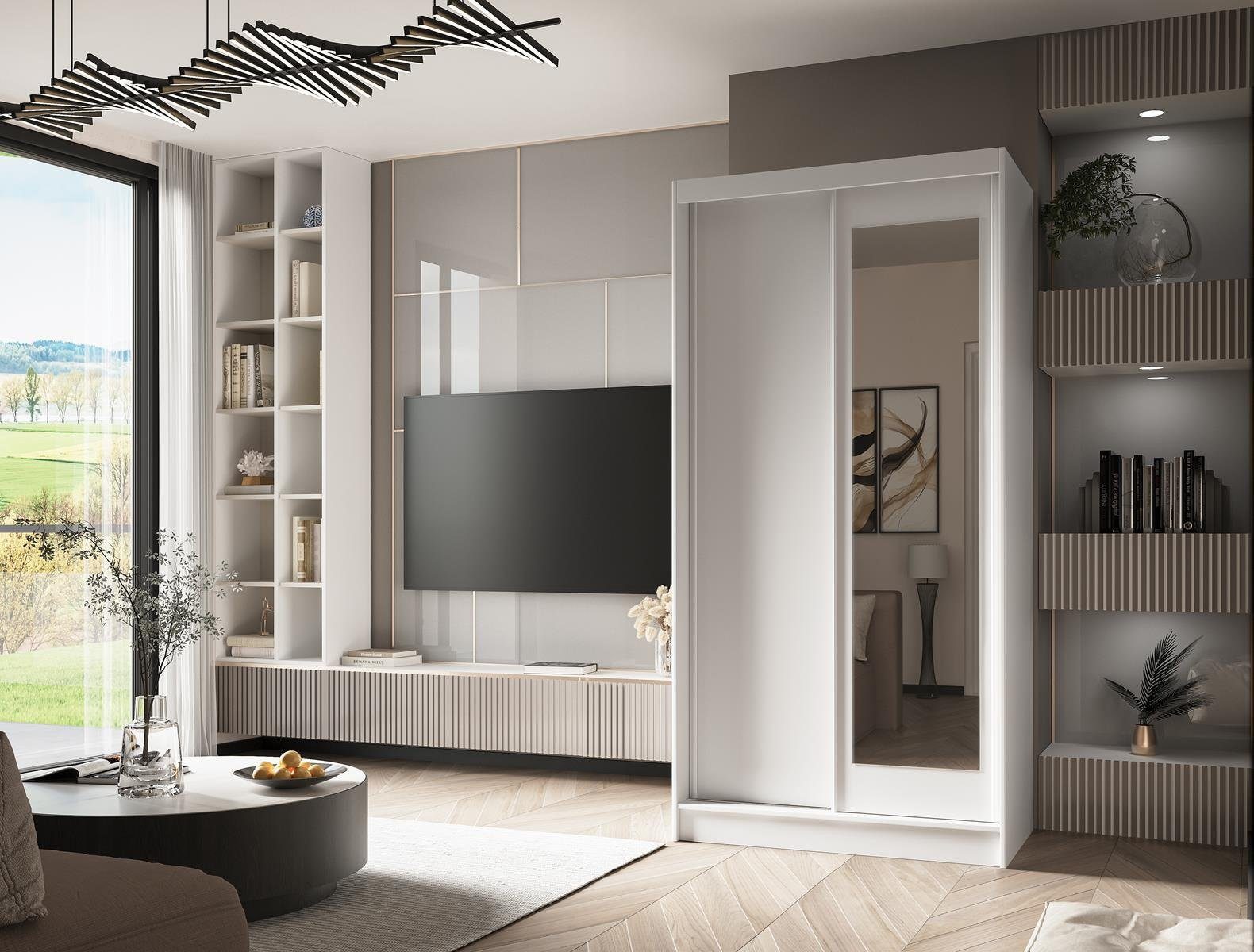 Wir präsentieren Ihnen ein Angebot für einen modernen Kleiderschrank Ali mit einem Spiegel, der Elemente von Schönheit und Praktikabilität kombiniert! Kleiderschrank Ali passt perfekt in jedes Interieur von Loft bis modern. Der zweitürige Schrank Ali besteht aus einer robusten 16 mm Laminatplatte, hat abgerundete Kanten aus ABS und Aluminiumschienen zum Schieben der Tür. Erhältlich in drei verschiedenen Farben: Weiß, Schwarz und Eiche artisan sowie in drei verschiedenen Größen: 100 cm, 150 cm und 200 cm, so dass für jeden etwas dabei ist. Im Inneren des Kleiderschranks befinden sich: Kleiderstange und Regale in einer Konfiguration, die von der Размер des Kleiderschranks abhängt.