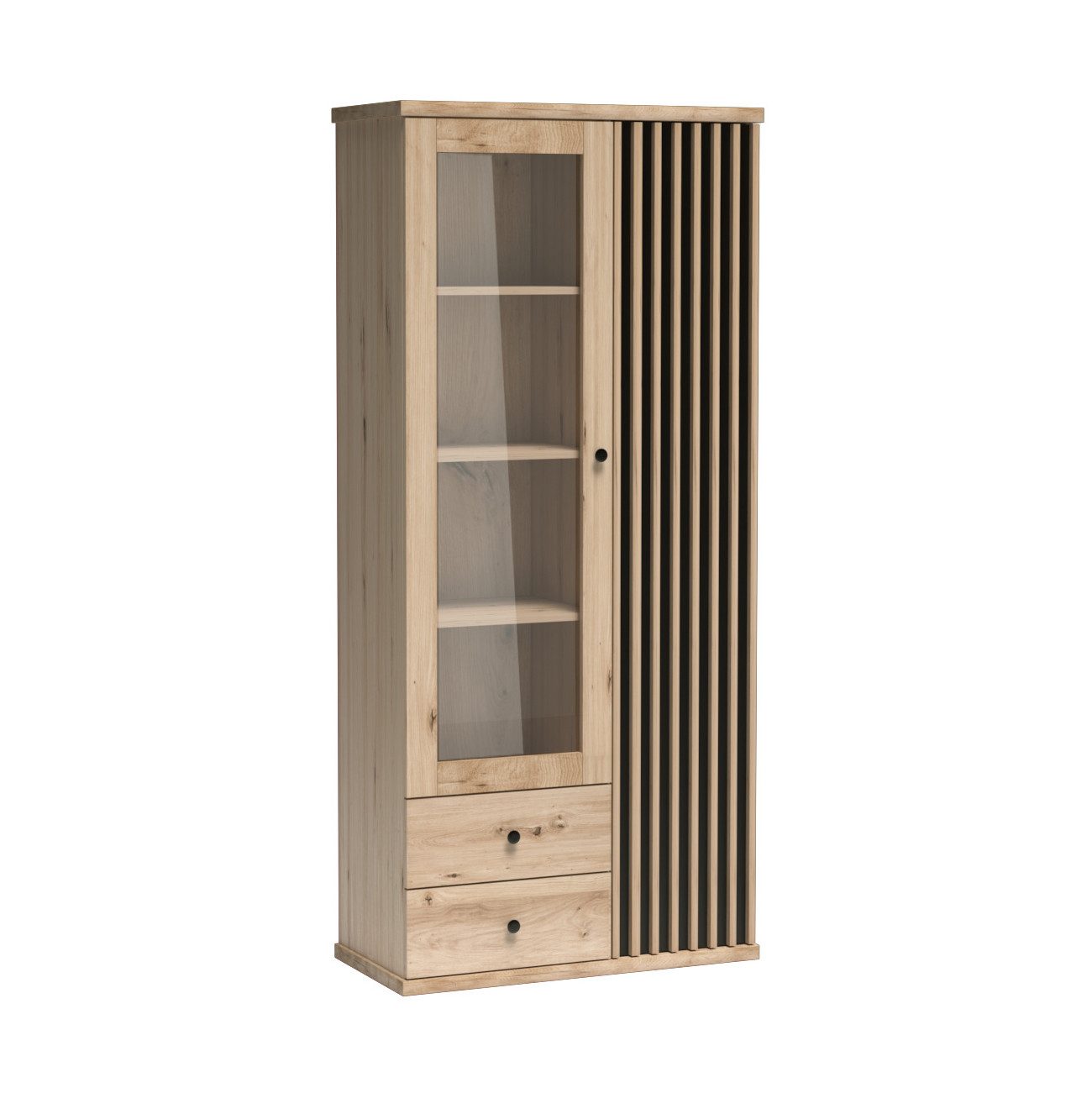 Die hohe Vitrine CAYA C-2 besticht durch ihr modernes Loft-Design mit eleganten vertikalen Lamellen in Artisan Eiche kombiniert mit mattem Schwarz. Die Glasfront präsentiert Ihre Lieblingsdekorationen stilvoll und geschützt.