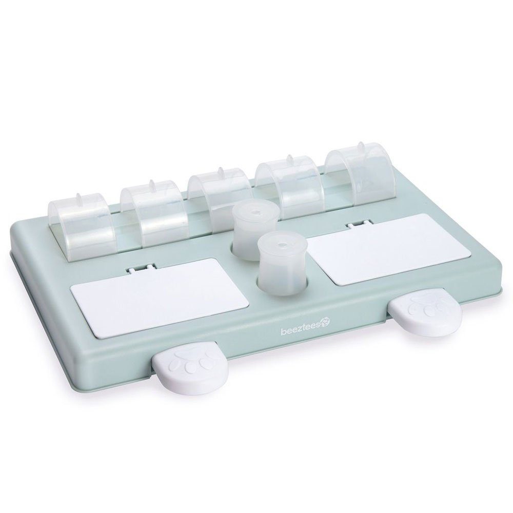 Für ein glückliches Hundeleben ist neben körperlicher Auslastung auch wichtig, den Welpen regelmäßig geistig zu fordern. Das Beeztees Puppy Intelligenzspielzeug Riff sorgt in dieser Hinsicht für eine sinnvolle Beschäftigung. Der Hund soll nach seiner Belohnung suchen, indem er die Verstecke zum Beispiel durch das Anheben von Kunststoff-Hütchen oder das Herausziehen oder Bewegen von Schiebern öffnet. Das Spielzeug aus Kunststoff ist robust und hygienisch zu reinigen. So haben Hund und Halter lange Freude an diesem tollen Spielzeug. Dabei sollen seine Menschen natürlich unterstützen, indem sie bei der Lösung der Denkspiele helfen und den Hund zunächst auf die richtige Fährte bringen. Diese intensive Interaktion stärkt die Bindung zwischen Mensch und Tier und hilft dem Hund beim Vertrauensaufbau. Ideal also, um eine besondere Beziehung zu schaffen und zu festigen.