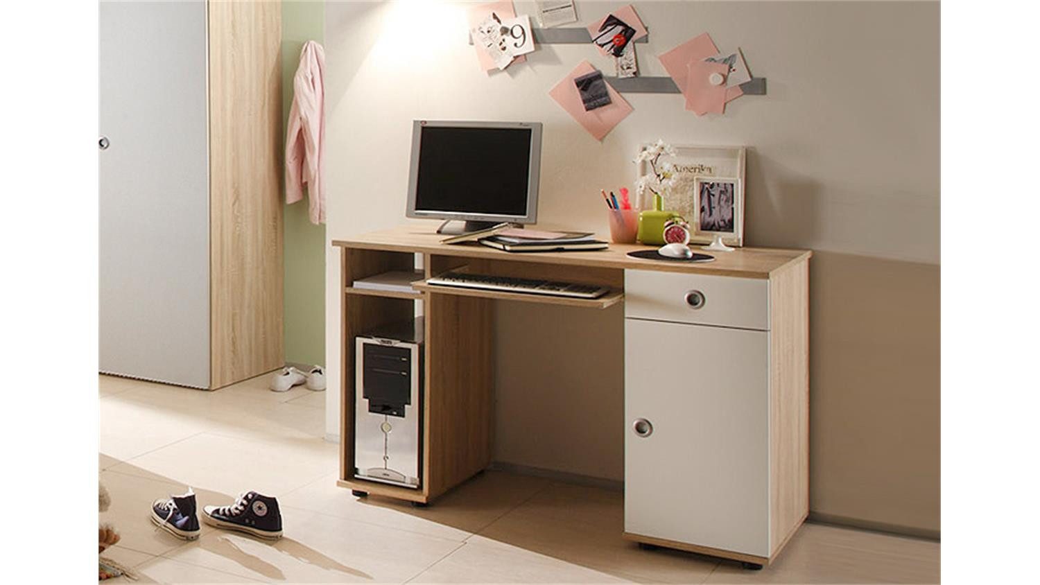 Der Schreibtisch aus der Serie Wiki passt farblich perfekt sowohl in Jungen- als auch in Mädchenzimmer. Mit Tastaturauszug und Fach für den Desktop-PC bietet der Schreibtisch ausreichend Stauraum.