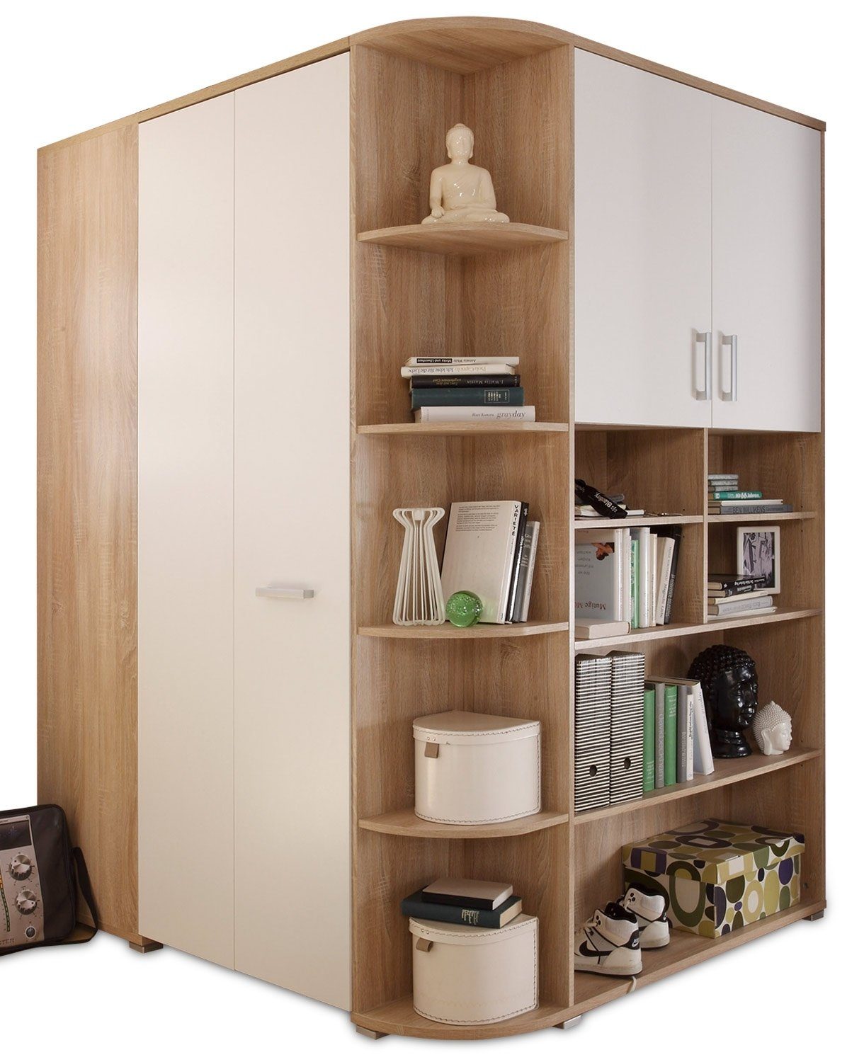 Lieferumfang | 1 Eck-Kleiderschrank mit 21 Ablageflächen, 2 Türen, 1 Kleiderstange, 7 Kleiderhaken und 1 faltbaren Schiebetür |