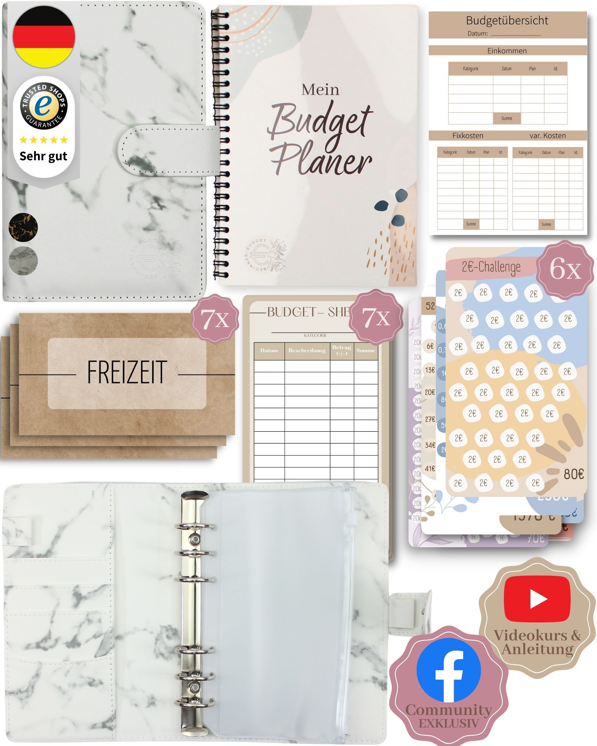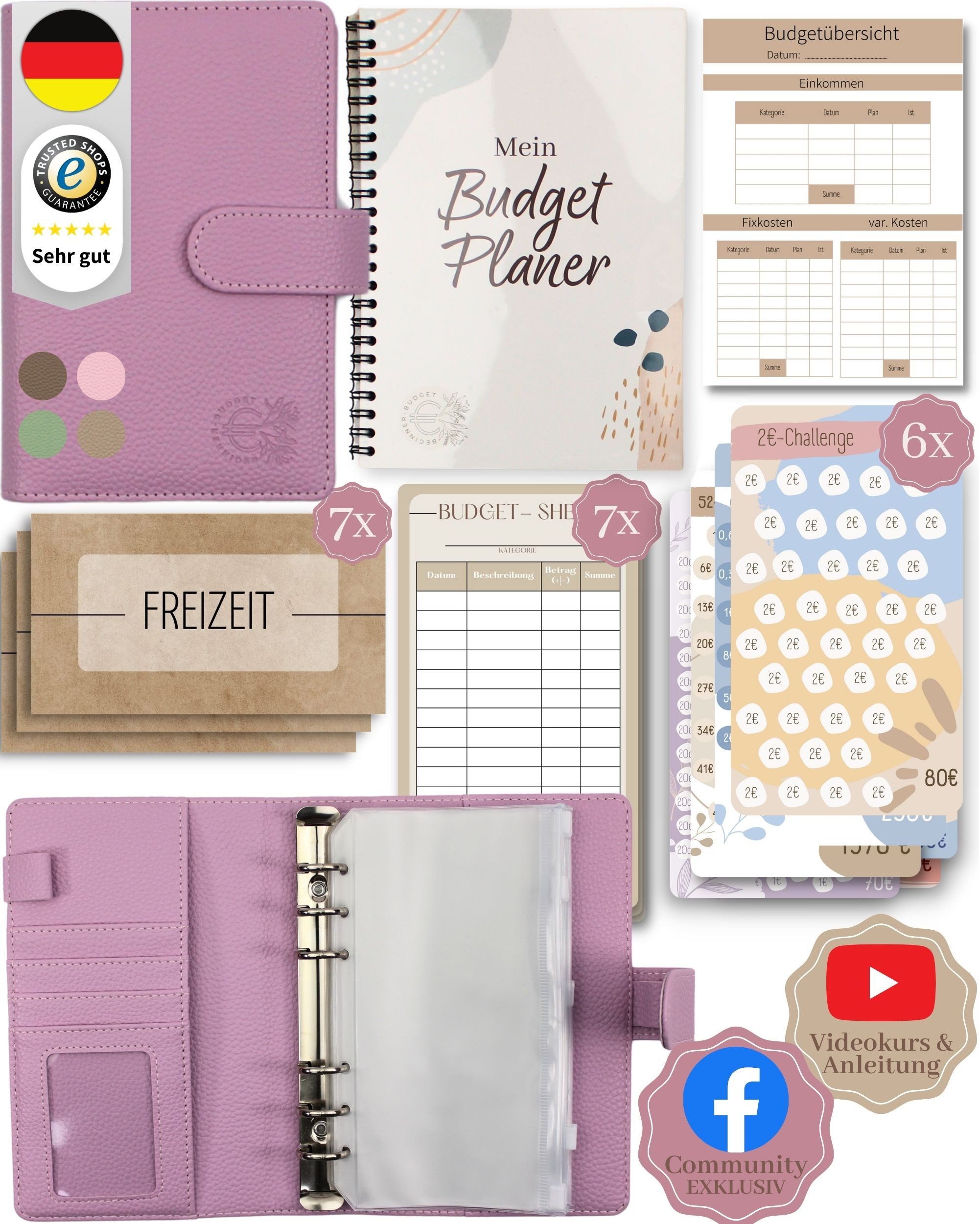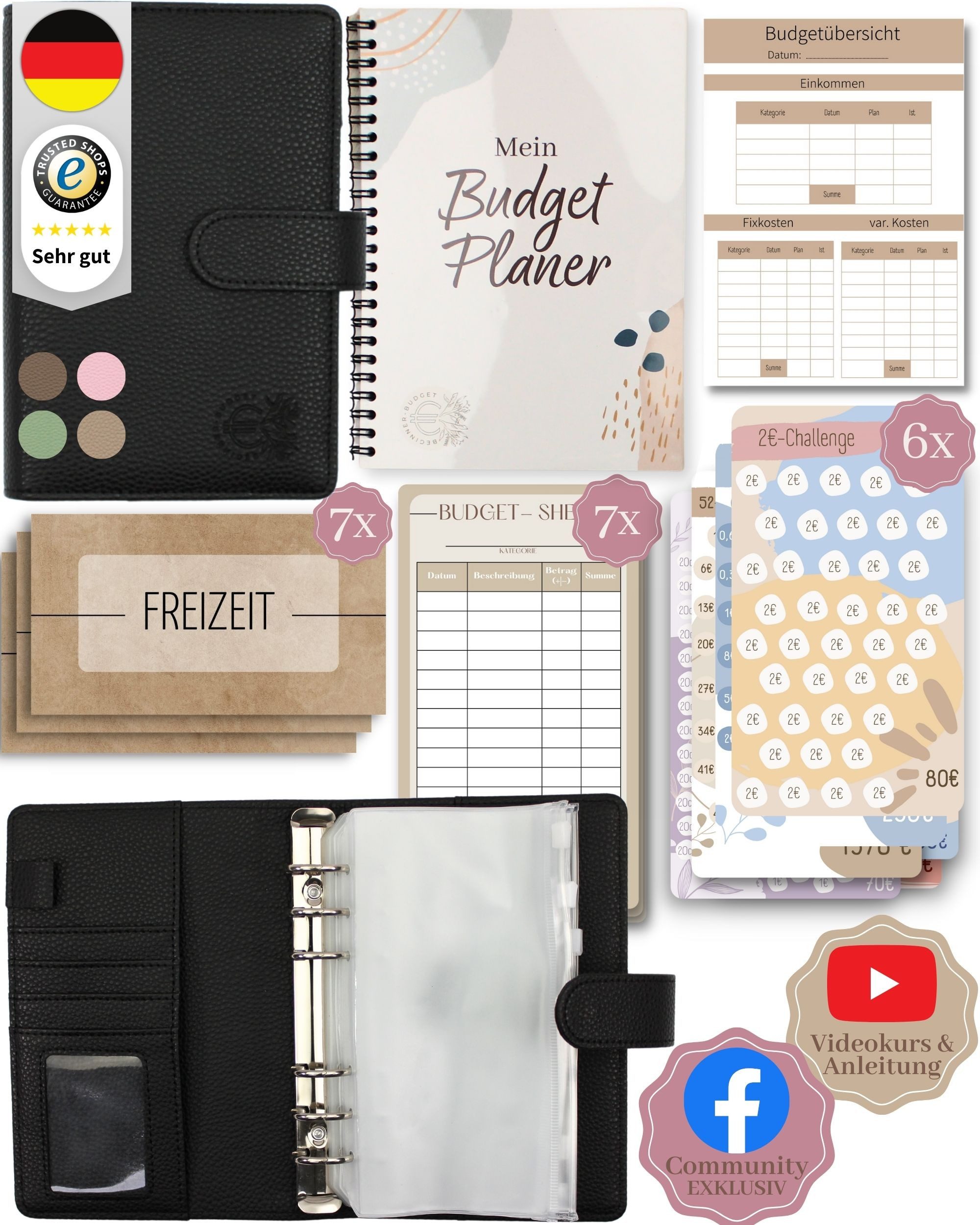 Ausstattung | 1x Binder Personal A6, 1x Budget Planner (Haushaltsbuch), 1x Budgetübersicht, 7x Dashboards (Категории), 10x Budget Sheets, 6x Spar-Challenges, Kostenloser Videokurs, Anleitung, 1x Bargeld-Tracker |