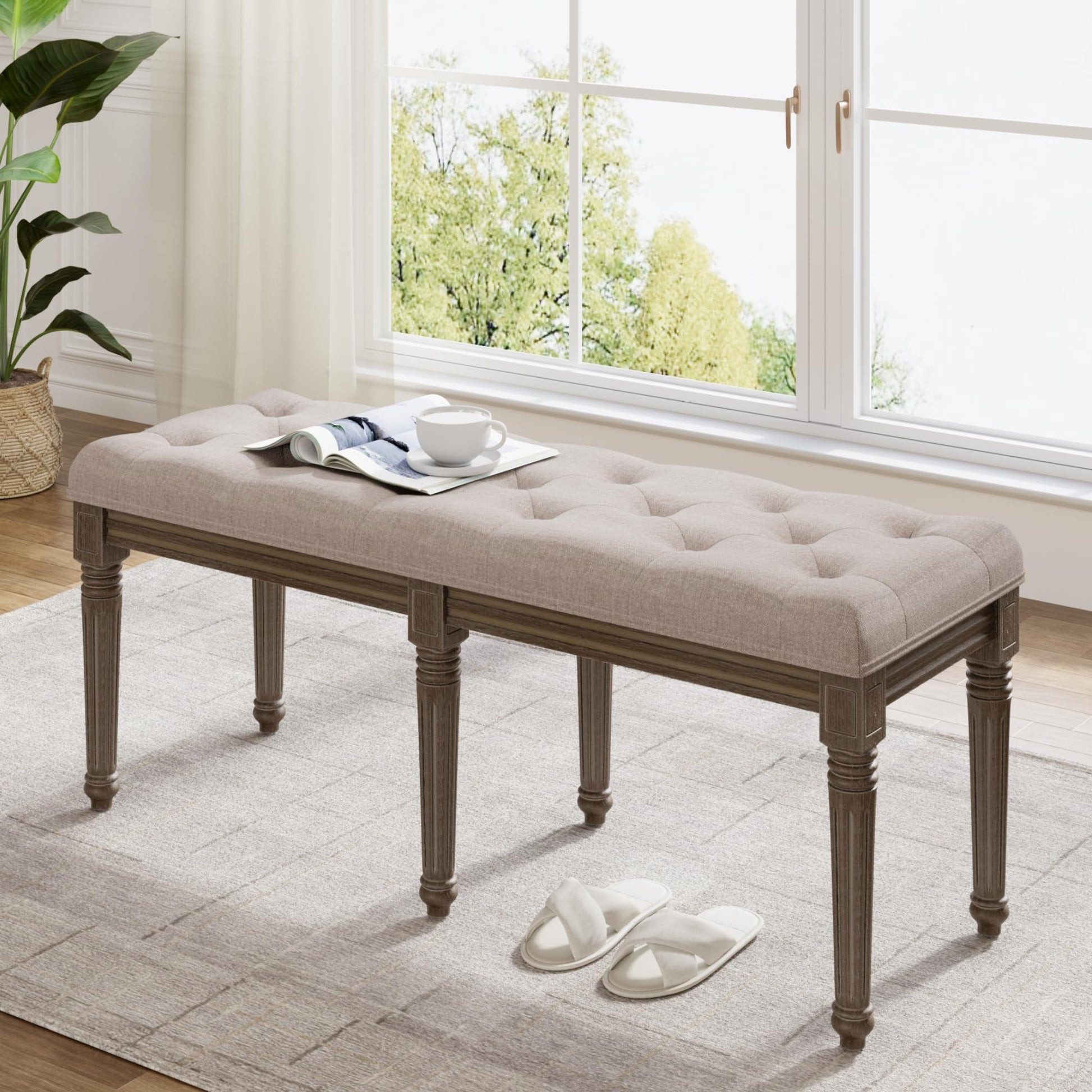 Bench Französischen Sitzbank 47x43x122 Sitzbank Vintage,Getuftete Sitzbank Gepolsterte Schuhbank Klavierbank für Wohnzimmer, Foyer, Flur,Esszimmer und Schlafzimmer Farbe: Beige Möbeldekor: Holz Marke: Bench Beinstil: dicken und anmutig geschwungenen römischen Beinen Höchstgewichtempfehlung: 300 kg Material: Kunststoff Stil: Rustikal Hervorragende Vielseitigkeit : Dieser Sitzbank ist unglaublich vielseitig und kann als Flurbank, Schlafzimmerbank, Schuhbank oder zusätzliche Sitzgelegenheit im Esszimmer, Wohnzimmer oder Schlafzimmer verwendet werden. Seine Fähigkeit, nahtlos in jeden Raum zu passen, macht ihn zu einer großartigen Wahl für alle, die ein vielseitiges Möbelstück suchen Überragende Qualität : Die solide Gummiholzkonstruktion bietet Strapazierfähigkeit und Stabilität, sodass die Ottomane bis zu 600 lbs Gewicht standhalten und regelmäßig genutzt werden kann. Die Kunststoff-Gummipads an den Bankbeinen schützen sowohl den Boden als auch reduzieren Geräusche, was sie zu einer praktischen Wahl für jeden Raum macht. Französischer Landhausstil : Die Kombination aus den Römischen Beinen, den Knopftuftkissen und den zarten Schnitzereien an den massiven Holzbeinen verleiht eine Note von Raffinesse. Der rustikale Charme der Originalholzfarbe und der Stoffkissen hebt perfekt den französischen Landhausstil hervor. Die Flurbank ist eine perfekte Ergänzung für jeden Raum auf der Suche nach einem charmanten und zeitlosen ästhetischen Wert. Ultra bequem gepolstert : Erleben Sie eine unvergleichliche Weichheit mit dieser Flurbank mit 5cm dicker weicher Polsterung. Sie ist so konzipiert, ultimativen Komfort mit ihrer hochelastischen Schaumstofffüllung und Leinenpolsterung zu bieten. Sie können sich in die üppige Polsterung sinken lassen und ein luxuriöses und komfortables Sitzerlebnis genießen. Einfach zu montieren : Die Montage dieser französischen Landhaussitzbank ist ein Kinderspiel. Schrauben Sie einfach die Holzbeine in jede Ecke, und in nur 5 Minuten können Sie Ihre wunderschön montierte Ottomanebank genießen. Artikelgewicht: 14,2 Kilogramm