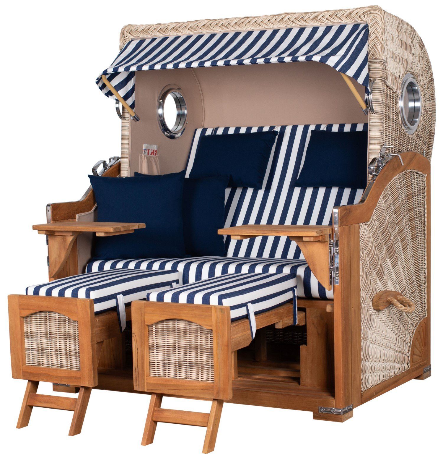 Strandkorb Ammersee Grande XL – maritimer Sitzkomfort für die ganze FamilieDie robuste Teakholzkonstruktion des Strandkorbs sorgt nicht nur für eine stabile, sondern auch langlebige Basis. Das hochwertige Teakholz ist bekannt für seine Widerstandsfähigkeit gegenüber Witterungseinflüssen. Die hochwertigen Materialien des Strandkorbs bieten zusätzlichen Schutz vor Sonne und Wind. Ein leicht zu pflegendes Geflecht und weiche Polsterung machen den Strandkorb nicht nur bequem, sondern auch leicht zu reinigen.