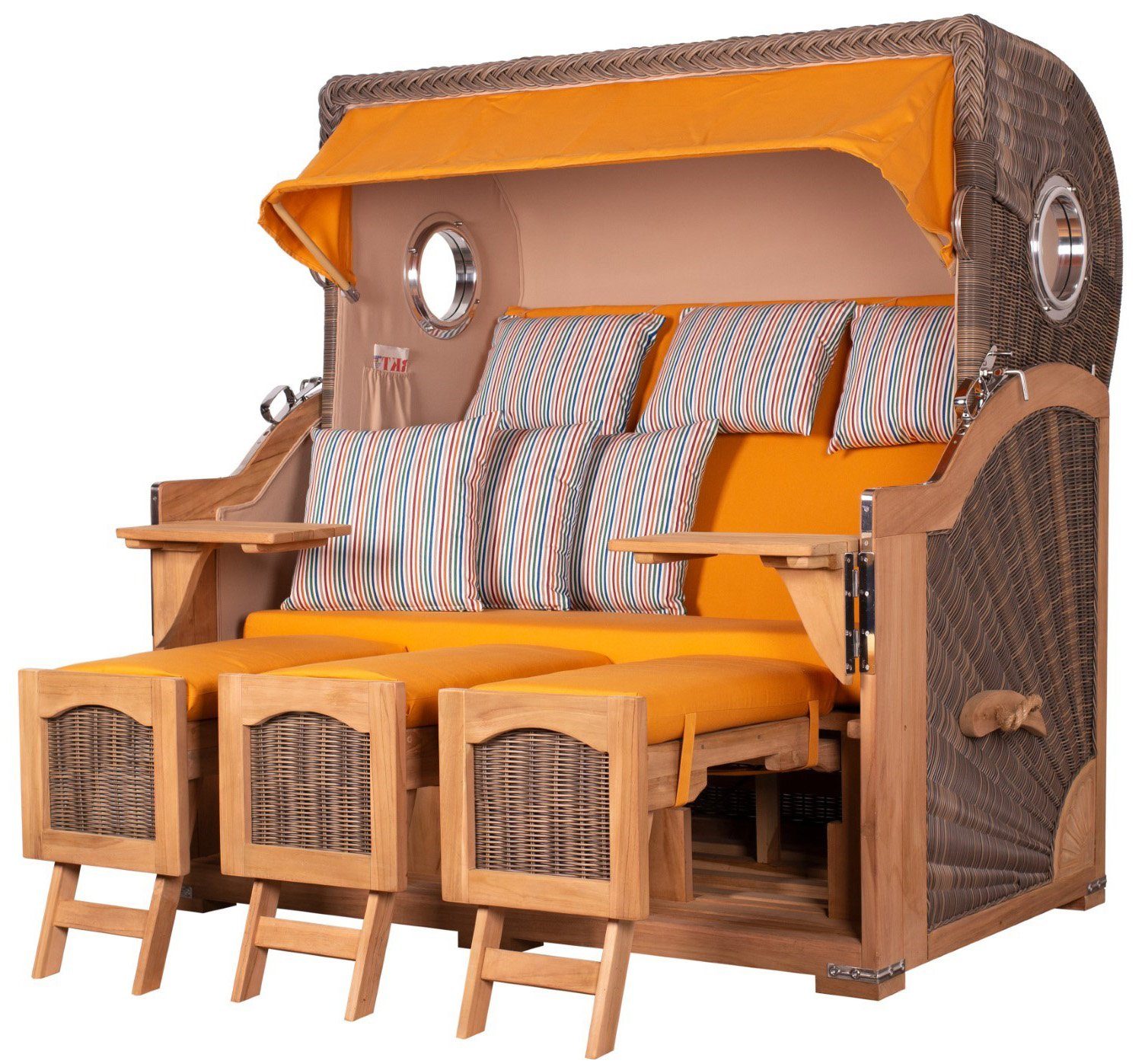 Der extra breite Strandkorb wird aus robustem Plantagen-Teakholz gefertigt und mit stabilen Polyrattangeflecht abgerundet. Das Sonnenflecht-Design des Rattans und die seitlich eingelassenen Aluminium-Bullaugen verleihen dem Strandkorb eine maritime Optik. Die verwendeten Materialien sind nicht nur wetterfest, sondern auch sehr langlebig und pflegeleicht.