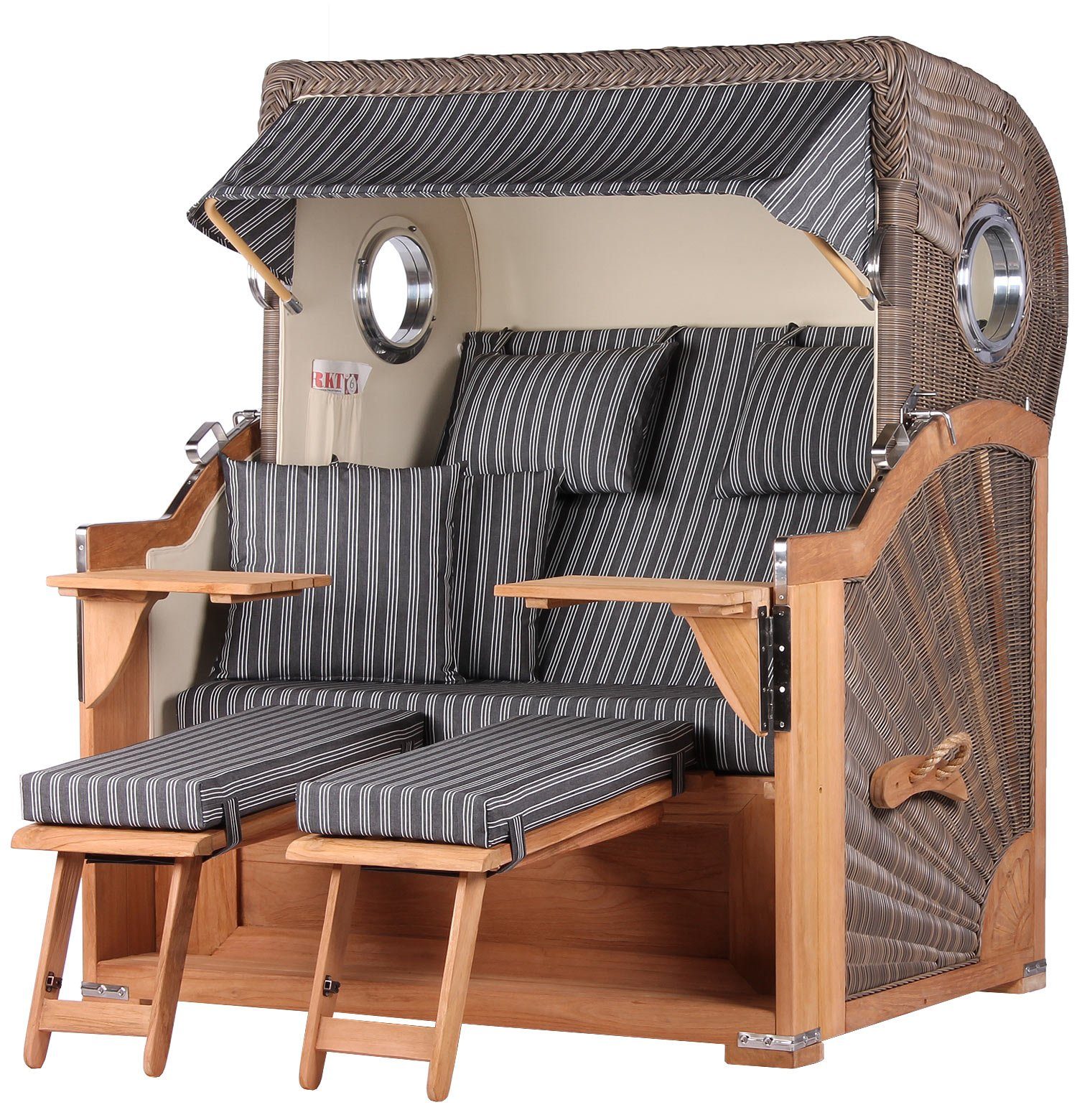 Der absolute Clou: Bullaugen aus Sicherheitsglas. Sie verleihen dem Strandkorb einen maritimen Flair und sorgen für mehr Licht im Oberkorb. So können Sie entspannt ein Buch lesen, auch wenn die Sonne schon am Untergehen ist.
