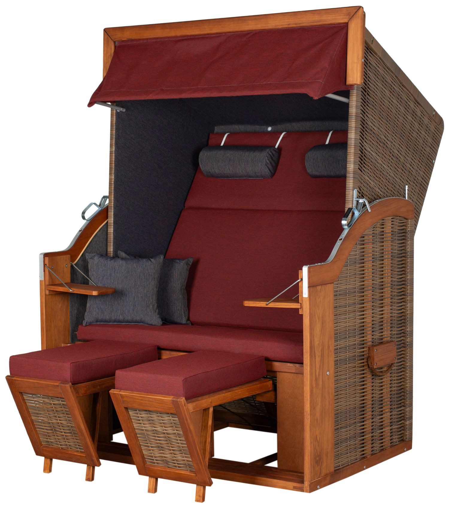 Lieferumfang | 1x Strandkorb-Korpus, 1x Sitzpolster, 1x Rückenpolster, 2x Wurfkissen, 2x Nackenkissen, 2x Fußpolster, 2x Fußstützen, 1x Sonnenmarkise, 2x Klapptisch |
