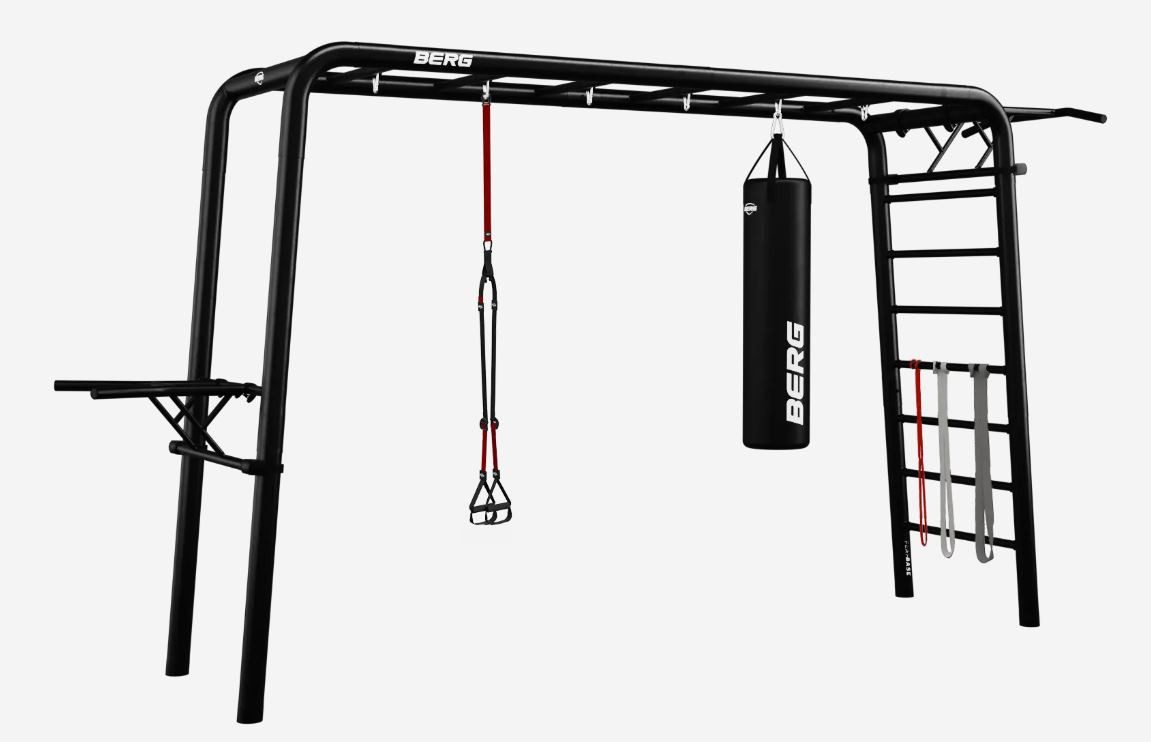 BERG Playbase 3-in-1 Klettergerüst Large Schwarz mit Reckstange, Leiter & Monkey Bar, inkl. Klimmzugstange, Dip bar, Fitnesseil, Widerstandsbänder und Boxsack.