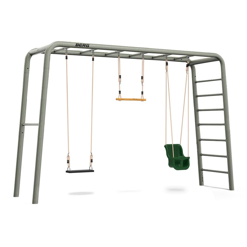 Die BERG PlayBase überzeugt durch ihren starken und robusten Rahmen, der absolute Stabilität garantiert. Der gesamte Rahmen zeichnet sich durch eine patentierte Rohrverbindung aus und dieser wird unterirdisch verankert, sodass die BERG PlayBase absolut sicher in Position steht und daher nicht einbetoniert werden muss. Die Maße hier bei der Medium Варианты sind 285 cm lang, 100 cm tief und 245 cm hoch. für die Seiten kann man zwischen einer Reckstange, einer Leiter oder einer Kombination aus beidem wählen. Eine genial durchdachte Konstruktion für die vielen Accessoires und ein sicheres und langanhaltendes Spielvergnügen.