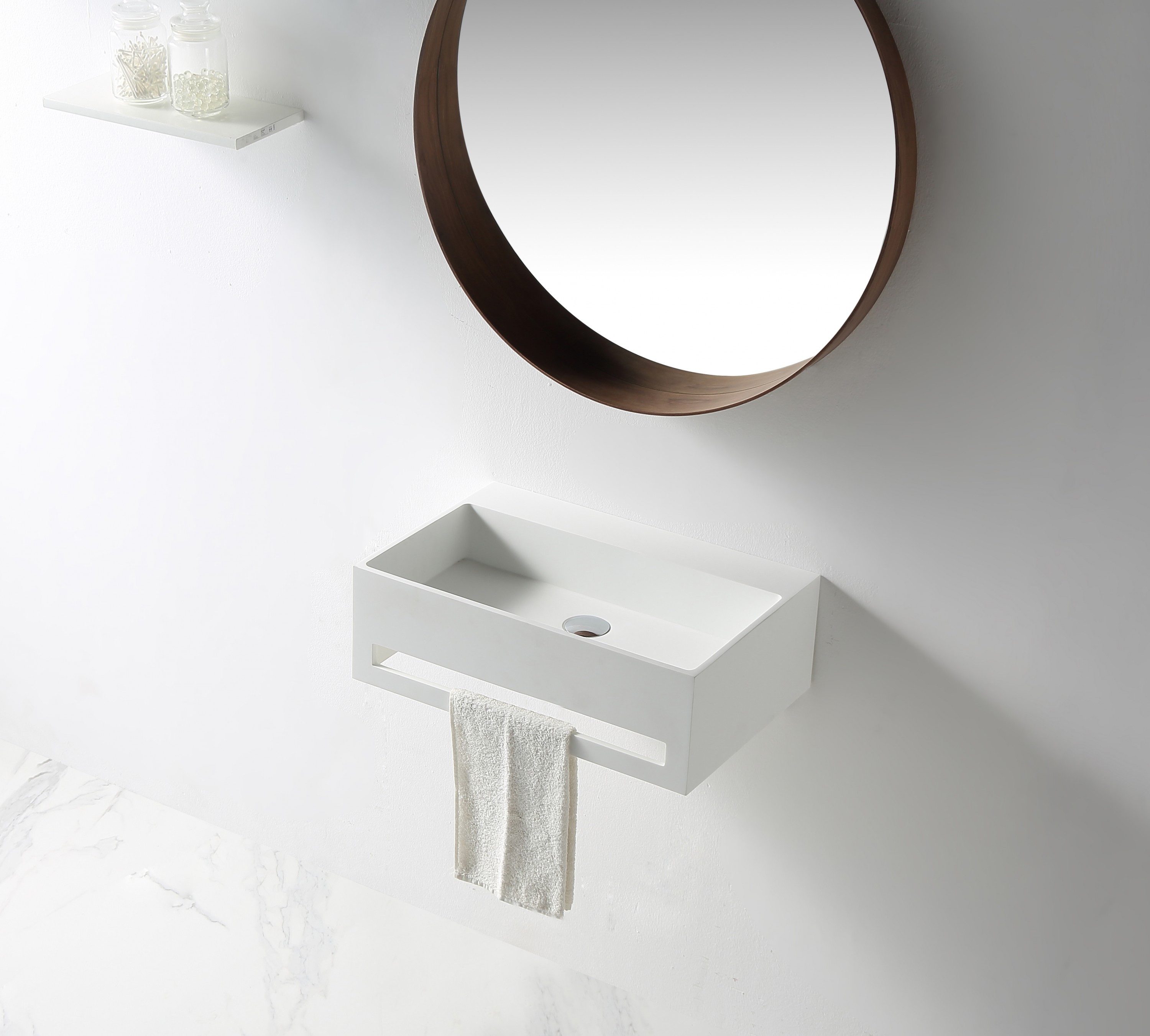 Wandwaschbecken TWG02 aus Mineralguss Solid Stone - Weiß matt Das Wandwaschbecken TWG02 überzeugt durch seine klare, geometrische Formgebung und der praktischen Bauweise. Es hat vorne einen integrierten Handtuchhalter, sodass Sie Ihre Handtücher einfach und bequem zum Trocknen aufhängen können. Das Becken besteht aus hochwertigem Mineralguss Solid Stone. Die Oberfläche in Weiß matt ist glatt und porenfrei und bei Berührung angenehm warm. Schmutz kann sich nicht festsetzen, somit ist das Becken hygienisch und einfach zu reinigen. Die abgebildete Armatur und das Pop-up sind im Angebot nicht enthalten. Sie können sich für eine Aufsatz- oder Unterputzarmatur entscheiden (Armaturloch nicht vorgebohrt). Für die Wandmontage sind Löcher vorgebohrt, damit Sie auch ein Standard-Waschbecken-Vorwandelement nutzen können. Montagematerial für die Wandmontage wird mitgeliefert. Spezifikationen Material Hochwertiger Mineralguss Solid Stone Farbe Weiß matt Form Eckig Maße 60 x 40 x 20 cm (B x T x H) Durchmesser Abfluss 5 cm Gewicht Netto 13,5 kg / Brutto 15,5 kg Maße Verpackung 68,5 x 48,5 x 28,5 cm Glatte und porenfreie Oberfläche (antibakteriell) Farbbeständigkeit Mit integriertem Handtuchhalter Ohne Ablaufventil Ohne Überlauf Geeignet für Aufsatz- und Unterputzarmatur (Armaturloch nicht vorgebohrt) Mit vorgebohrten Löchern zur Wandmontage Geeignet für Standard-Waschbecken-Vorwandelement DIN-Anschluss Für alle DIN-Ablaufventile geeignet