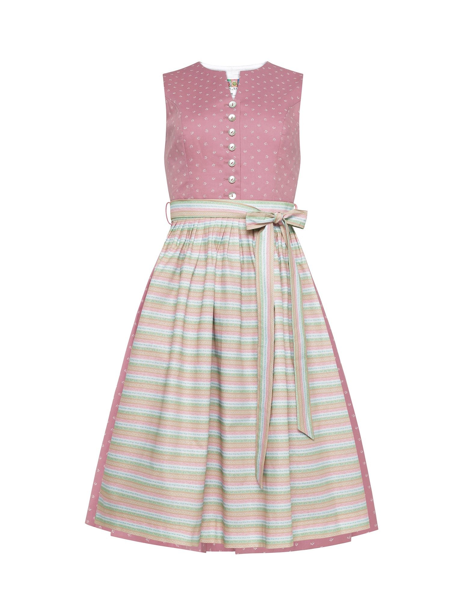 2. Schürze: Die Schürze ist aus hochwertigem Streifenstoff gefertigt, der einen eleganten Kontrast zum floralen Oberteil bietet. Die sorgfältige Verarbeitung und der strukturierte Look der Streifenschürze verleihen dem Dirndl eine edle Ausstrahlung.
