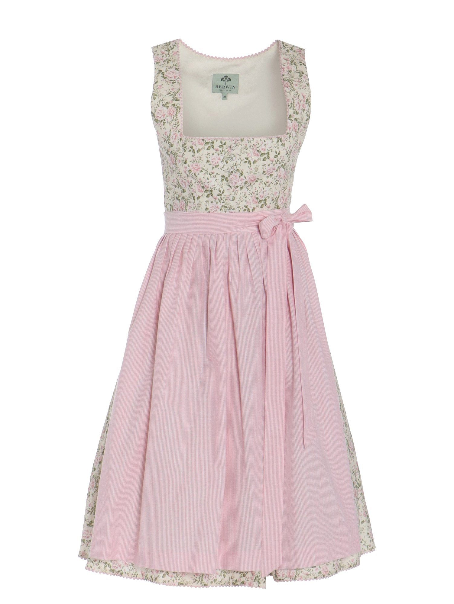 Hellgrundiger Rosendruck – Ein zarter, femininer Stoff, der dem Dirndl eine frische, romantische Note verleiht.