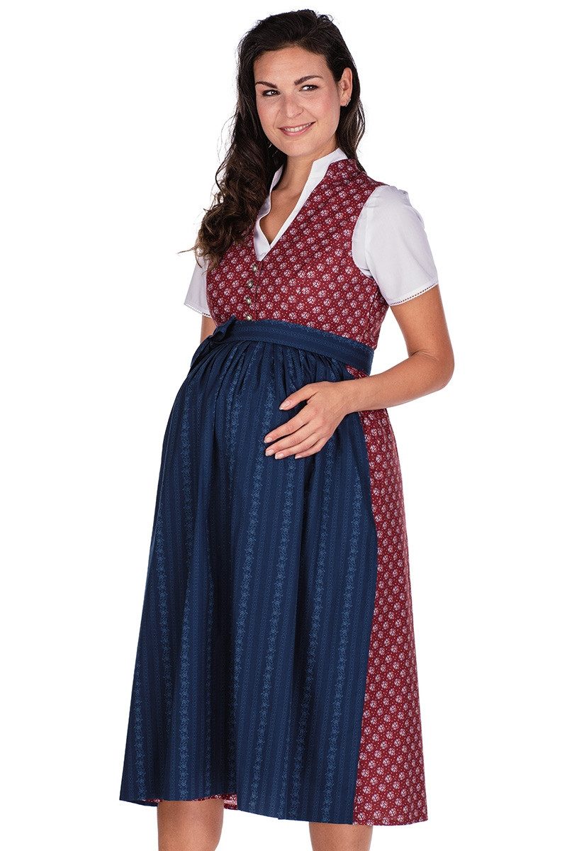 Dieses romantische Umstandsdirndl "Madlina" wird aus reiner, angenehmer Baumwolle gefertigt und hat allover ein Printmuster aus entzückenden Blumen-Arrangements und klitzekleinen Blümchen auf einem rostroten Untergrund. Das kurze, sauber abgefütterte Mieder im Retro-Stil ist tailliert mit Wiener Naht geschnitten, hat einen Stehkragen mit V-Ausschnitt und eine kurze Knopfleiste mit altsilbernen, zart floral gemusterten Ösenknöpfen. Links gibt es ab dem Armausschnitt einen verdekten Reißverschluss. Der ausgestellte, wadenlange Rock ist oben gerafft. Einen tollen Kontrast ergibt sich durch die zauberhafte, am Bund in schmale Kellerfalten gelegte Baumwoll-Schürze mit Bindeband in Marine mit dem stilvollen Streifen-Printmuster aus Blumenranken und zarten Wellenlinien aus Punkten. An heißen Tagen kann das Dirndl auch super ohne Dirndlbluse getragen werden. Im Lieferumfang ist das Dirndl mit der Schürze enthalten, eine Dirndlbluse ist nicht inbegriffen. Bitte beachten Sie den Größenzuschlag bei Размер 48.