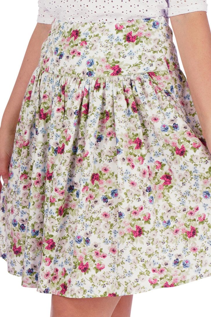 Dieser wildromantische, knielange Trachtenrock namens Thalea im floralen Design besteht aus reiner, leichter Baumwolle und hat eine ausgestellte A-Linienform. Der angesagte breite Bund ist verstärkt und links gibt es einen verdeckten Reißverschluss. Die Teilungsnaht zum Rockteil, der oben für einen niedlichen Faltenwurf fesch gerafft ist, ziert eine schmale Paspel in Grün. Das traumhafte Allover-Printmuster aus herrlichen, detailreichen Blumen in verschiedenen Designs und Farben macht den verspielten Damenrock, der sich wundervoll zu Trachtenbluse, Blusenshirt und -Body kombinieren lässt, zum sommerlichen Eyecatcher.