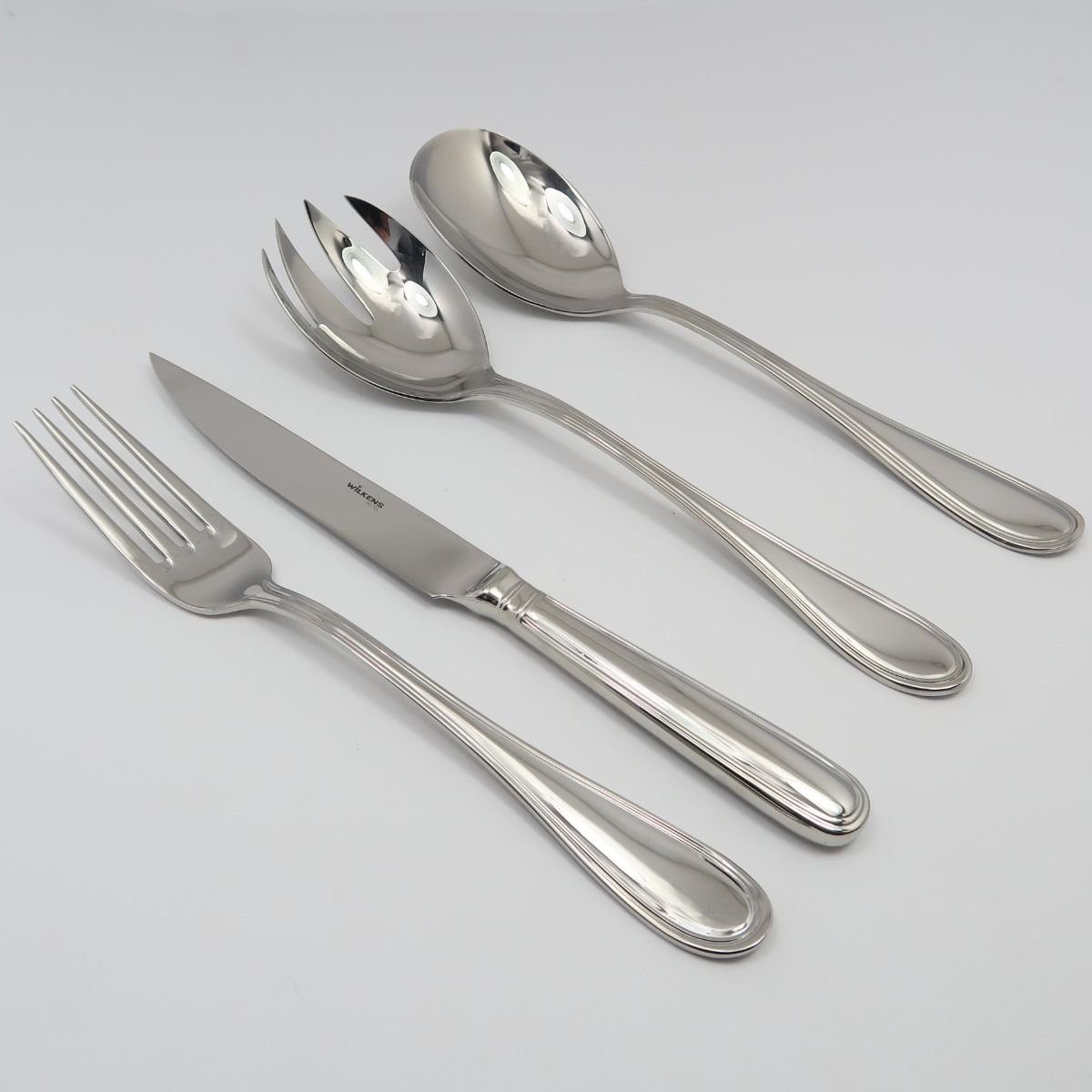 Wilkens 12-tlg. Steakbesteck + 2-tlg. Salatbesteck Schwedisch Faden in 18/10 Edelstahl Edles Steakbesteck plus Salatbesteck von WILKENS in Edelstahl: Steakbesteck-Set besteht aus 6 Steak Messer und 6 Tafel Gabel. Das Salatbesteck besteht aus je einem Salat Löffel und einer Salat Gabel. Neu und Exklusiv das Original Schwedisch Faden Tafelbesteck der Spitzen-Gastronomie. Aus dem Wilkens Stilklassiker heraus entwickelt bieten wir dieses elegante Besteck jetzt auch in 18/10 Edelstahl an. Steakmesser: 24 cm; Tafelgabel: 21,5 cm; Salatlöffel: 24 cm; Salatgabel: 23,5cm Seit über 200 Jahren werden die Bestecke und Accessoires in präziser Handwerkskunst, mit viel Liebe zum Detail und zur Perfektion gefertigt. Die Produkte aus Sterling Silber, edler Versilberung oder Edelstahl definieren sich daher nicht nur über ihre Funktion – es geht bei WILKENS um viel mehr als ums Dinieren, nämlich um Wertschätzung und die Leidenschaft für das Besondere. WILKENS Bestecke geben Ihrer Tafel und den Stunden des Genusses luxuriösen Glanz, zeitlose Eleganz oder auch geschmackvolle Extravaganz. Langjährigen Mitarbeiter produzieren am Standort Bremen hochwertige Bestecke und stilvolle Accessoires. Die Tradition versteht sich dabei als Pflicht und Ansporn, praktische Funktionalität mit besonderem Design und höchster Qualität zu kombinieren. Ob in 925 Sterling Silber, der einzigartigen, Branchenhöchsten Versilberung mit 180g, oder hochwertigem Edelstahl – WILKENS Bestecke und Accessoires bringen Glanz und Exklusivität in Ihr Zuhause.