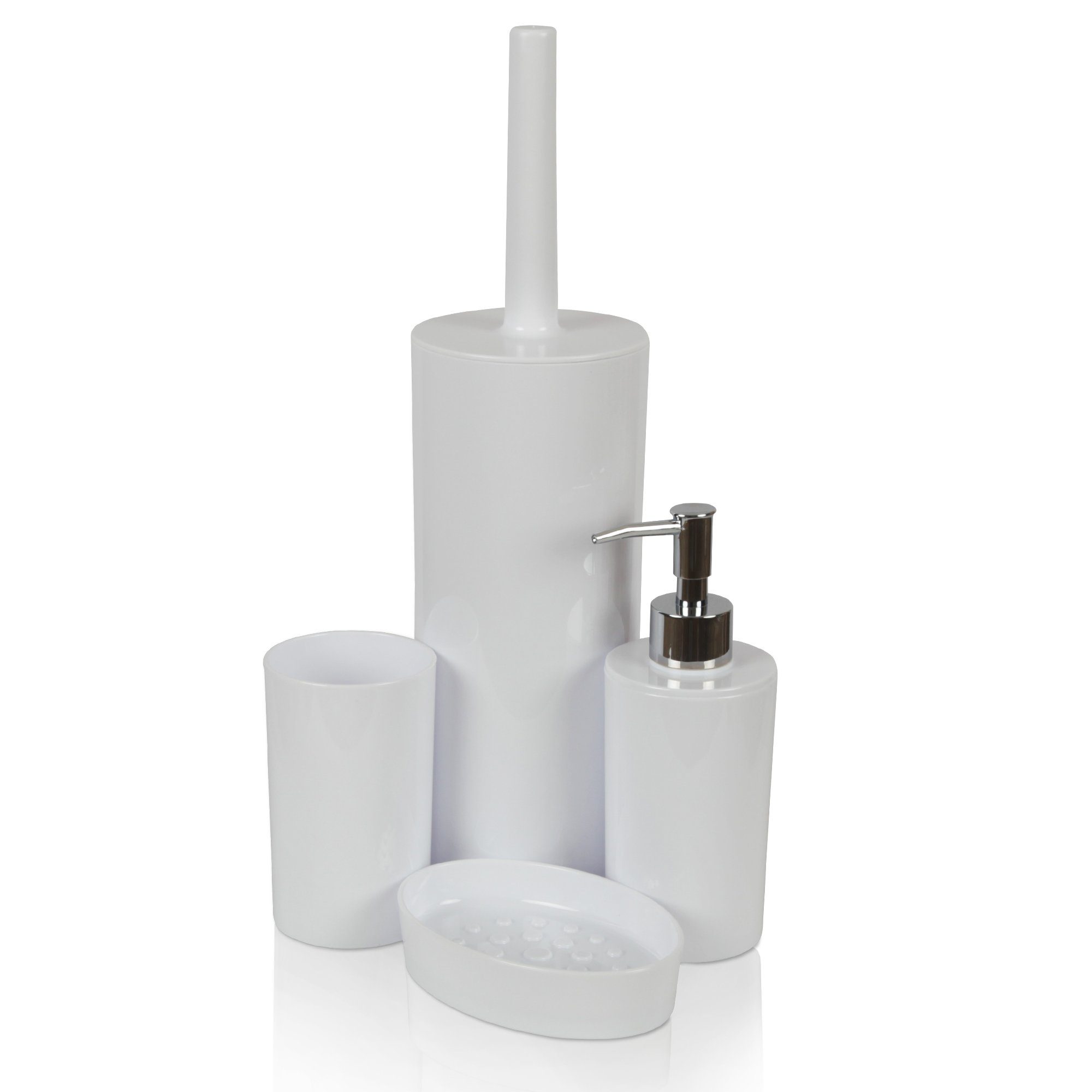 Lieferumfang | 1 Seifenspender Ø7cm x 18,5cm, 1 Zahnbutzbecher Ø7cm x 11,5cm, 1 Seifenschale 3cm x 13cm x 9cm, 1 WC-Garnitur 36,5cm x Ø9cm |