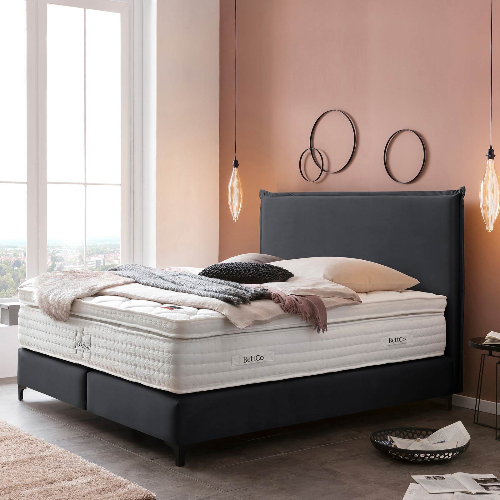 Ausstattung | 7-Zonen Taschenfederkern-Matratze Kopfteil hinten mit echtem Stoff bezogen Taschenfederkern-Unterbox Schwarze Metallfüße |