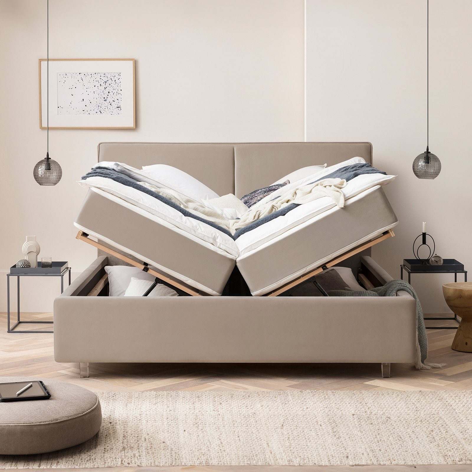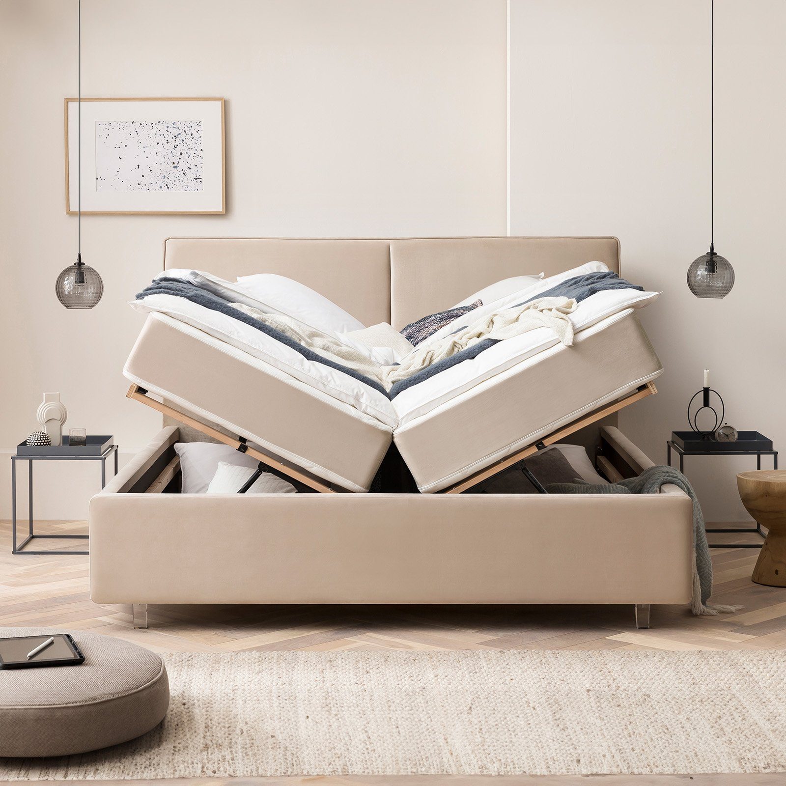 Ausstattung | Stauraum XXL Lattenrost Füße Acryl Bettgestell mit Bettkasten Wendematratze |