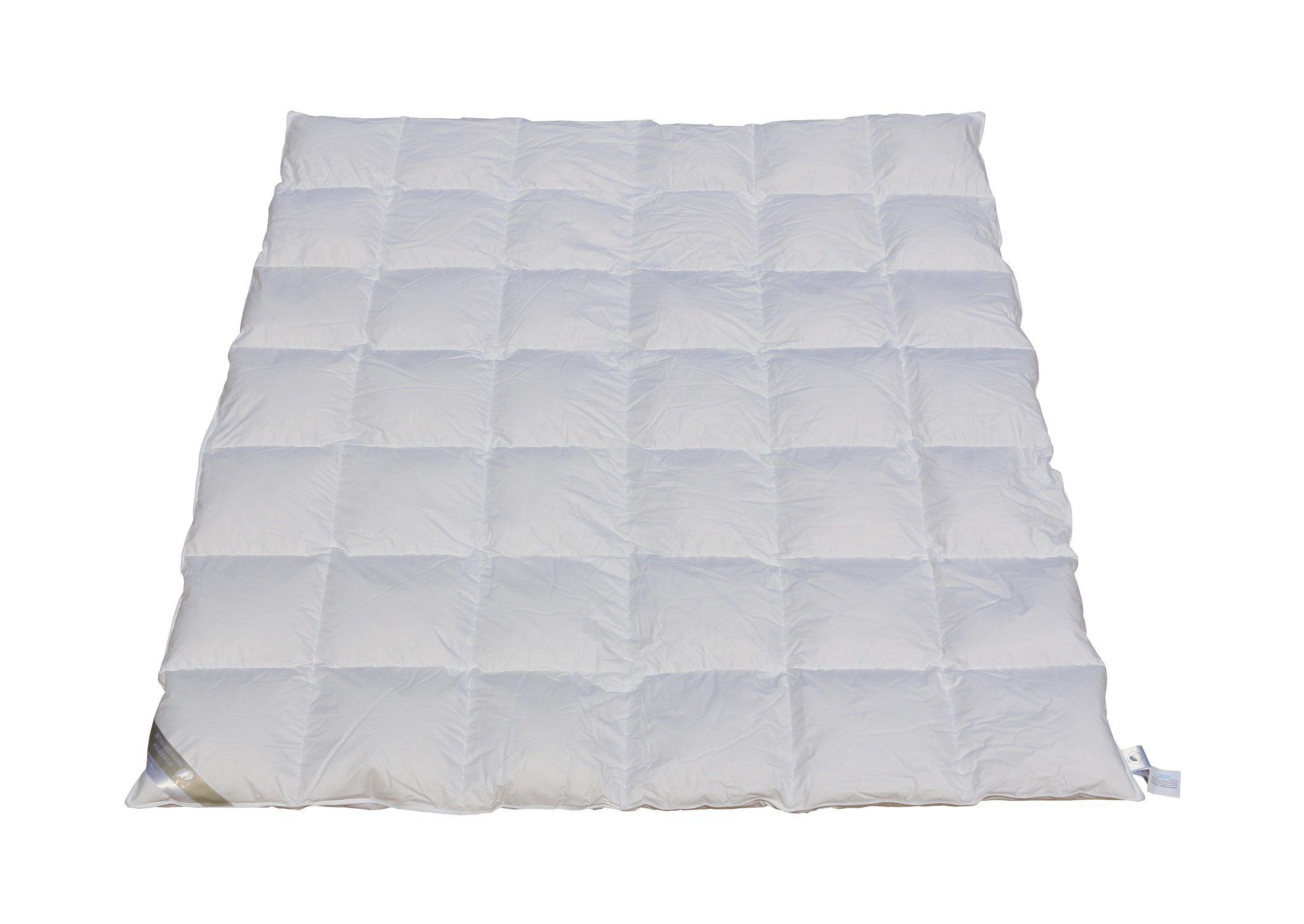 Hofmanns exklusive Franken Ganzjahres Daunendecke, 6x7, 240/220 cm. Leichte, warme Ganzjahresdecke. Natur pur: Daunen, Baumwolle und sonst nichts! fixierte Füllung - ohne jegliche Kältezonen, Füllung: 1600 Gramm neue weiße fränkische Gänsedaunen mit natürlichen Farbeinschüssen Klasse 1 (100% Gänsedaunen), Bezug: feinste Soft-Baumwoll-Einschütte NM 100, 100% Baumwolle superfein. Innensteghöhe 3 cm. Farbe: weiß mit Biese. Wärmegrad 4. Wasch- und Pflegehinweise: Waschbar bis 60°C, trocknergeeignet. Gütesiegel und Kennzeichnungen: kein Lebendrupf, eigene Anfertigung. Wir machen Ihnen die Entscheidung leicht. Daunenbetten mit 100% Daunenfüllung sind die qualitativ hochwertigeren und daher auch kostspieligeren Betten. Hierbei können Sie mit Sicherheit nur die richtige Entscheidung treffen, das wird Ihnen jeder Fachhändler bestätigen. Die Lebenserwartung einer Feder liegt zwischen 5-10 Jahren. Bei einer Daune liegt sie zwischen 20-30 Jahren. Das liegt daran, dass eine Feder brechen kann und somit schneller verschlissen ist als eine Daune. Ein einfacher Händler kann Ihnen nicht sagen was wirklich in Ihren Betten ist. Er muss sich darauf verlassen, was auf dem Bett geschrieben ist. Wir dagegen können Ihnen zeigen, welche Daunen und Federn in Ihren Betten gefüllt werden. Gerne können Sie auch dabei sein, wenn Ihre Betten bei uns angefertigt werden. Все unsere Daunen- und Feder Produkte werden in unserem Hause nach Auftragseingang selbst gefüllt und direkt an Sie ausgeliefert. Sie erhalten also immer frisch angefertigte Ware. Mehr Sicherheit kann Ihnen niemand geben! 10802