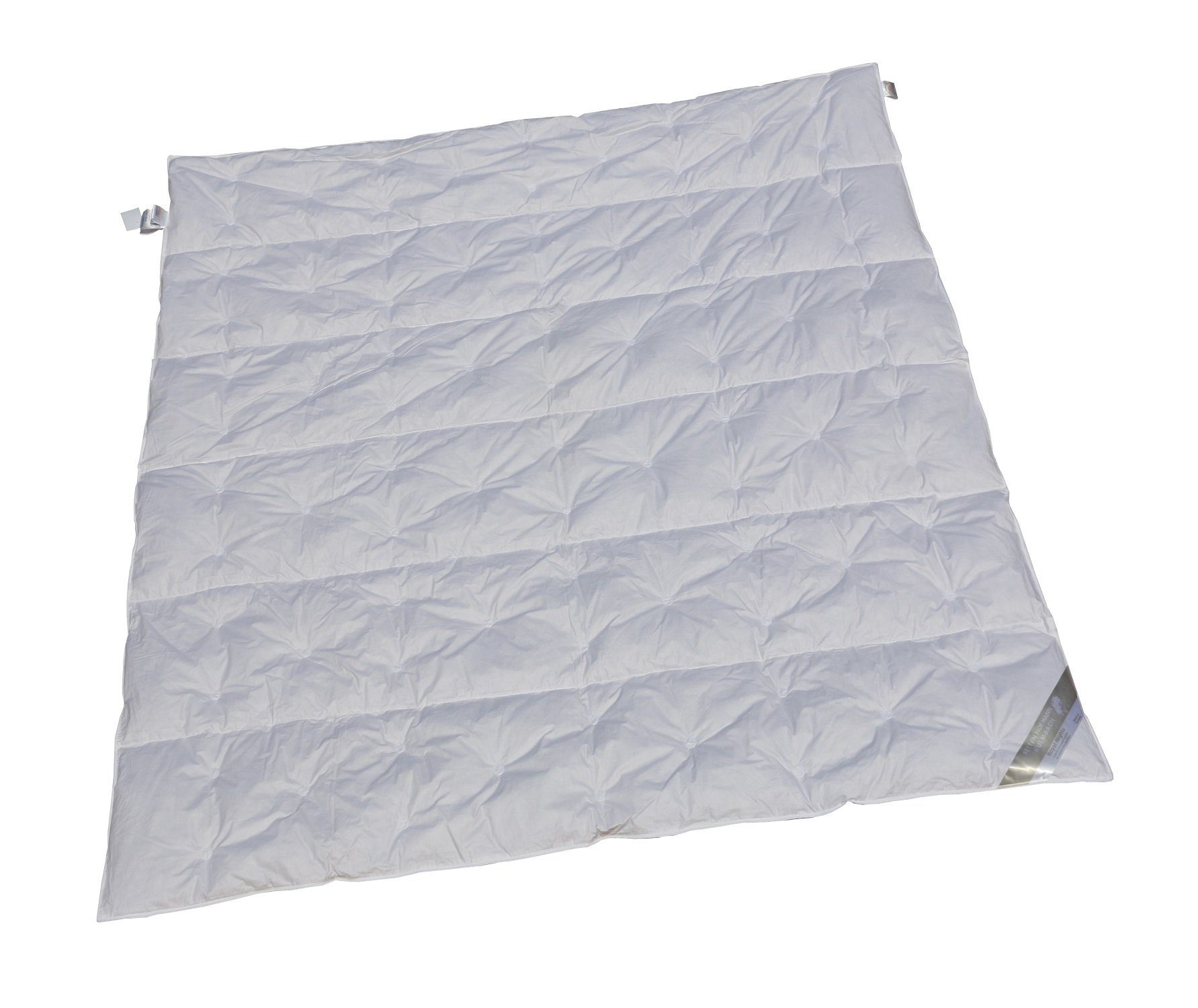 Der Bezug besteht aus feinster Soft-Baumwoll-Einschütte aus 100% Baumwolle (NM 100), die sich angenehm auf der Haut anfühlt und für ein natürliches Schlafklima sorgt. Die Füllung umfasst 630 g neue, silberweiße französische Landdaunen der Klasse 1.
