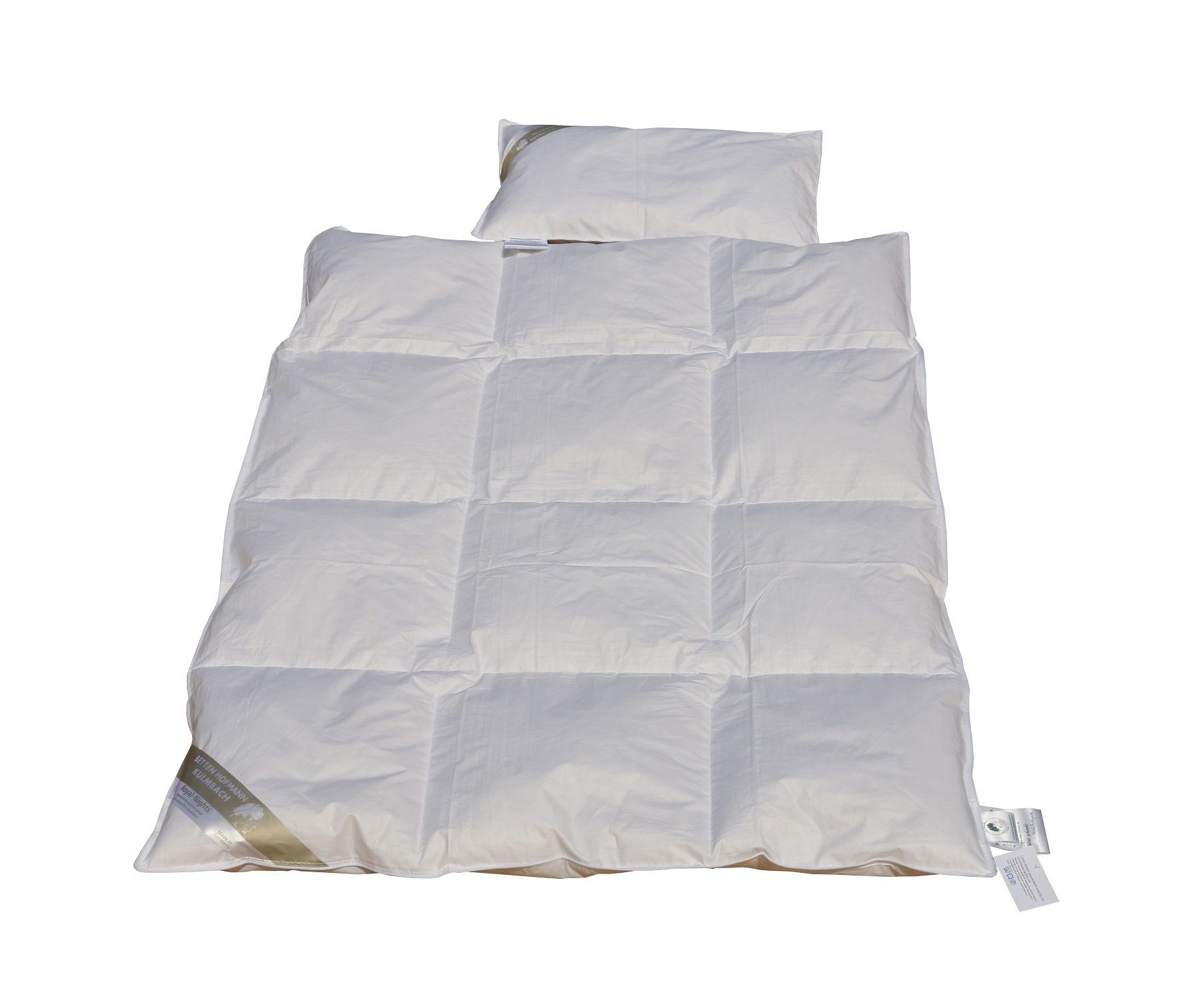 Baby Kinder Set Daunendecke 100/135cm mit Kissen 40/60cm. Kuschelig leichtes Daunenbett mit Kopfkissen. Himmlisches Kassetten-Bett für Kleinkinder und Babys Das Kassetten-Bett 3x4 100/135cm Bezug: feinste Soft-Baumwoll-Einschütte (100% Baumwolle), superweich Farbe: weiß mit Biese, Innensteghöhe 3cm, Füllung: 400g silberweiße neue ungar. daunen, Klasse 1 (100% Daunen) waschbar bis 60°, trocknergeeignet Das Kopfkissen 40/60cm Bezug: feinste Soft-Baumwoll-Einschütte (100% Baumwolle), superweich, Farbe: weiß Füllung: 70g silberweiße neue ungar. daunen, Klasse 1 (100% Daunen) waschbar bis 60°, trocknergeeignet. Eigene Herstellung bei uns im Hause, für Hausstauballergiker geeignet! Kein Lebendrupf