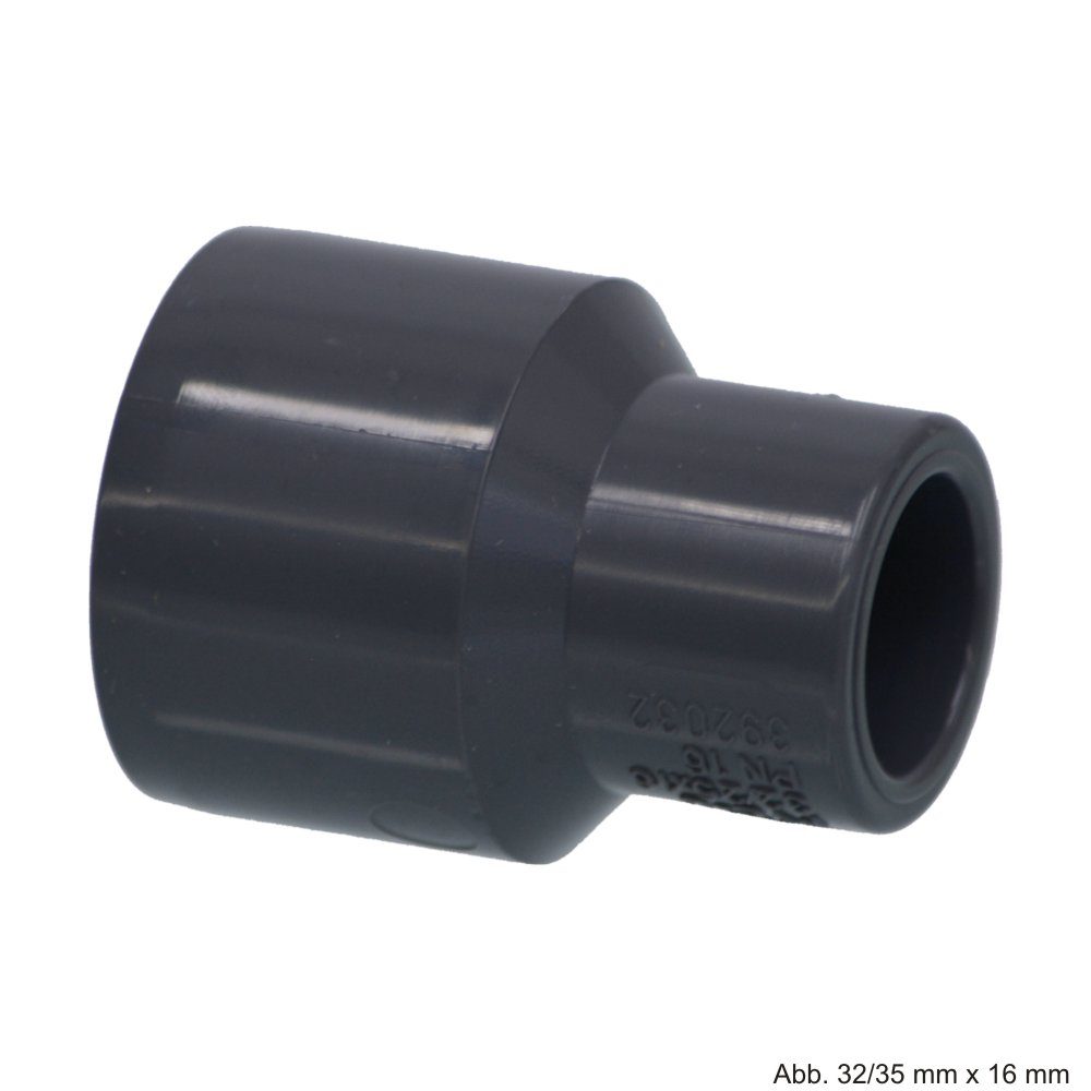 PVC-U Reduziermuffe, Klebestutzen/Klebemuffe x Klebemuffe, 16bar, 40/32mm x 32mm - Eigenschaften: Werkstoff: PVC-U (PVC-hart) = Polyvinylchlorid, entsprechend dem Standard für Druckleitungen aus PVC-hart. Farbe: grau. Die Verbindung erfolgt nach DIN 8063 bzw. EN 1452 mittels kalibrierloser Klebverbindung. Betriebsdruck: Richtwert für Kleb- und Übergangsfittings: PN 16 = 16 bar bei 20°C (Wasser) Richtwert für Übergangs- und Gewindefittings, Verschraubungen: Anwendungsbeispiele: Abwasserneutralisation, Apparate- und Anlagenbau, Autowaschanlagen, Chemische Industrie, Fischindustrie, Foto- und Filmindustrie, Galvanotechnik, Gewächshäuser, Schwimmbadbau, Kläranlagen, Pharmazeutische Industrie, Trinkwasser, Wasseraufbereitung, Schiffsbau u.v.m. Fittings aus PVC-U weisen generell alle Vorteile auf, die sich seit Jahrzehnten in allen Bereichen der Industrie und Installationstechnik bewährt haben. Vor allem die ausgezeichnete chemische Beständigkeit bietet die Gewähr für eine langlebige Gebrauchsdauer. PVC10751