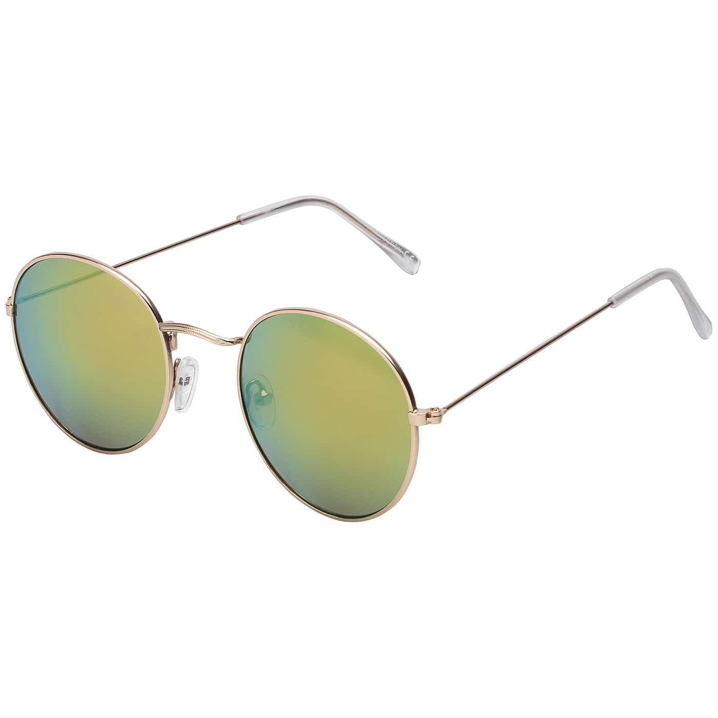 Runde Designer Damen und Herren Sonnenbrille Verspiegelt - Perfekte Sonnenbrille für den Sommer Entdecken Sie die perfekte Sonnenbrille für den Sommer mit dieser trendigen Rund Form-Sonnenbrille. Die Gläser sind in angesagten Farben erhältlich - Braun, Rot-Gelb, Blau, Lila-Blau und Grün-Rosa. Mit einem UV-Schutz von 400 schützt sie Ihre Augen vor schädlichen Sonnenstrahlen. Das Gestell besteht aus glänzendem Gold, während die Gläser in tollen Farben gehalten werden. Diese Kombination sorgt für einen stilvollen Look, der zu jedem Outfit passt. Diese Sonnenbrille bietet nicht nur Schutz, sondern ist auch ein modisches Accessoire für den Sommer. Bestellen Sie jetzt Ihre neue Sonnenbrille und genießen Sie den Sommer in vollen Zügen! Die Sonnenbrille hat einen 100% UV-Schutzfaktor 400 und ist ideal für den Schutz vor starken Sonnenstrahlen geeignet. Sie bietet eine Linsentrübung bis zur Klasse 3, was bedeutet, dass sie auch bei intensivem Sonnenlicht effektiv schützt. Mit Metall- und Kunststoffbügeln und Gläsern aus Polycarbonat ist diese Sonnenbrille sowohl robust als auch stilvoll. Sie können sicher sein, dass sie lange halten wird und Ihren Augen den nötigen Schutz bietet. Maße dieser Sonnenbrille: Breite der Bügel: ca. 125 mm Длина der Bügel: ca. 146 mm Höhe der Gläser: ca. 51 mm Breite der Gläser: ca. 51 mm Breite des Stegs: ca. 21 mm