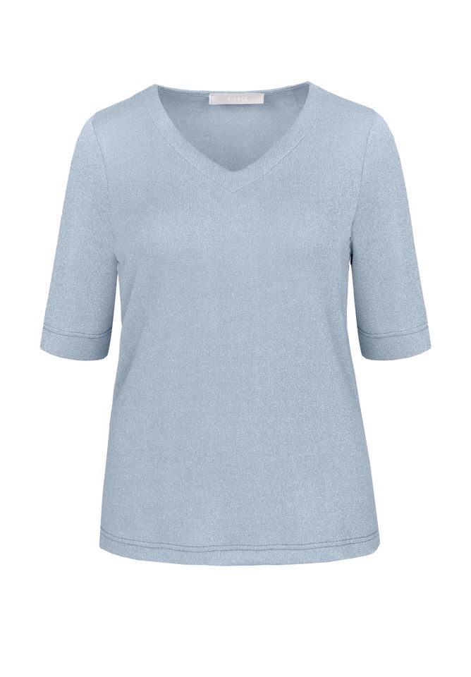 Das Bianca Basic Kurzarmshirt mit V-Ausschnitt ist die perfekte Kombination aus Komfort und modernem Stil. In der angesagten Unifarbe Smoke Blue überzeugt das Shirt durch seine feine Strickoptik mit dezentem Lurex-Glanz, die dem Look eine elegante Note verleiht. Der etwas längere, schmeichelnde Mailänder-Arm und der klassische V-Ausschnitt sorgen für einen lässig-eleganten Stil. Die lockere Passform mit geradem Schnitt bietet ein angenehmes Tragegefühl, unterstützt durch den hochwertigen Materialmix, der weich auf der Haut liegt. Ideal kombinierbar mit Jeans, Hosen oder Röcken – ein vielseitiger Begleiter für Alltag und Events.