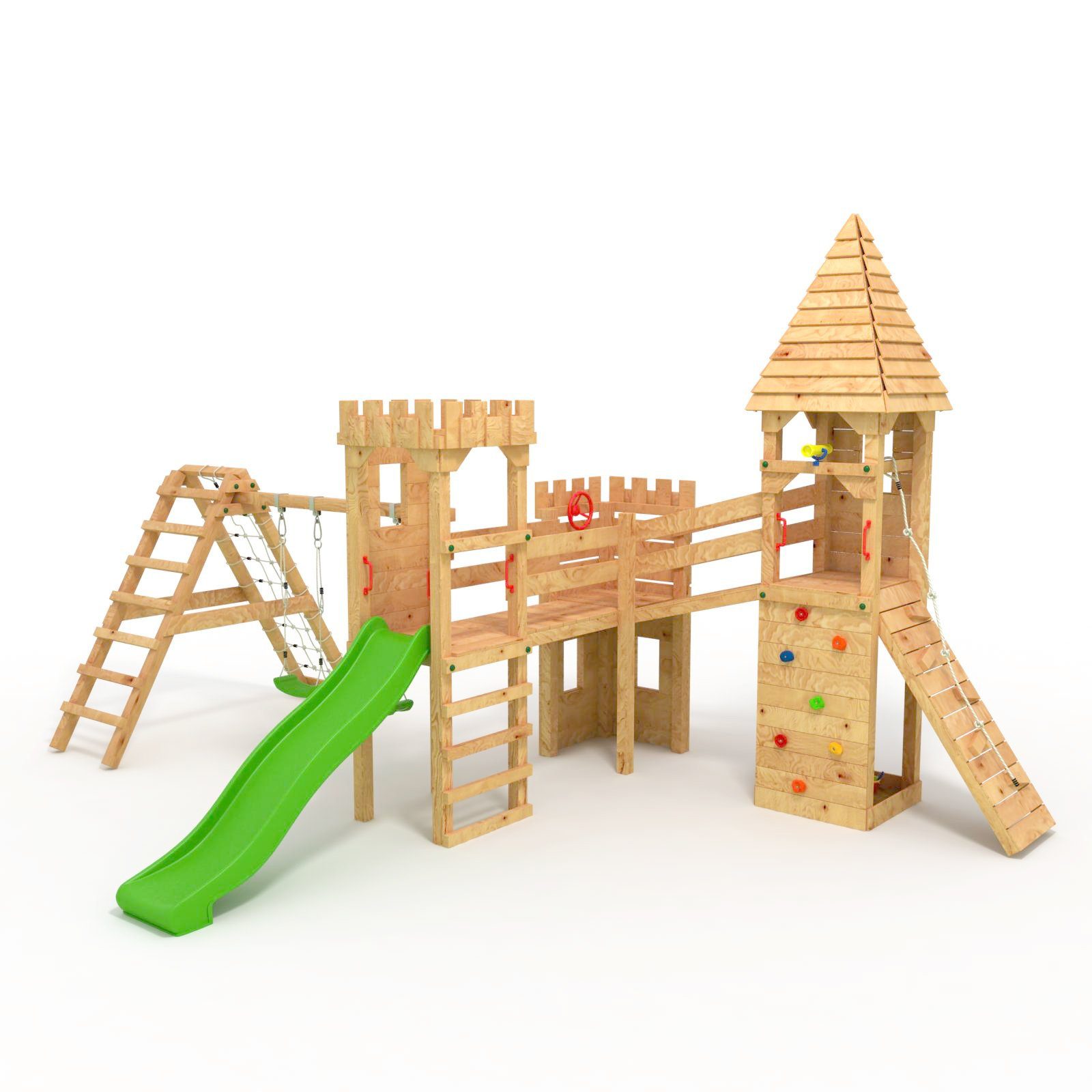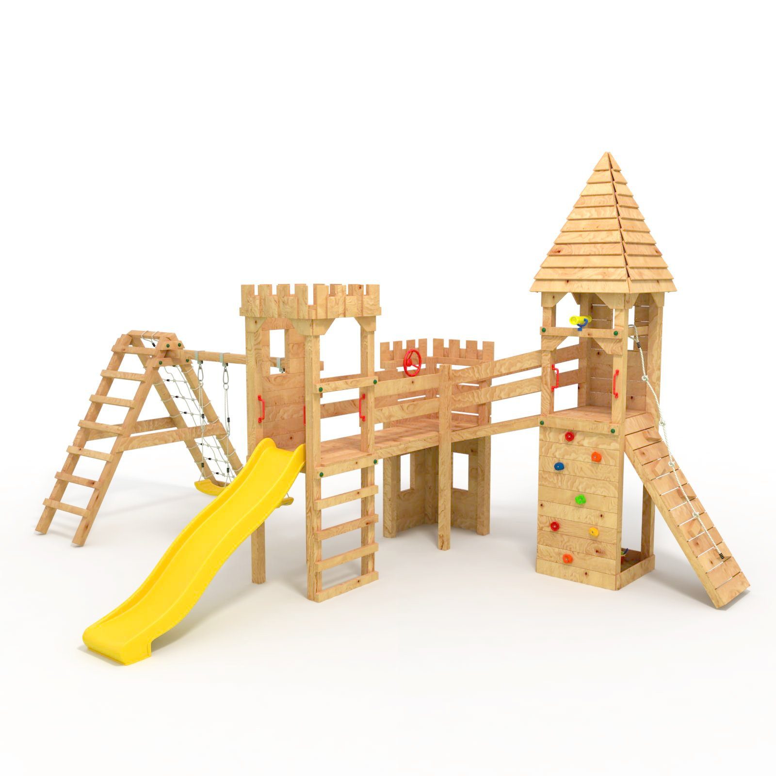 BIBEX Spielturm - Ob Ritter, Räuber, Piraten oder Helden! Hier ist alles Möglich, denn dieser Spielturm-Ritterburg ist einmalig. Der Turm verfügt über eine Leiter, eine geneigte Kletterwand mit bunten klettersteinen, sowie eine Wellenrutsche, bei der Sie sich für eine der 4 Farben entscheiden können. Auf der anderen Seite ist eine doppelte Schaukel angelehnt. Diese ist optional mit einem Kletternetz ausgestattet. Die Klettersteine haben eine rauhe Oberfläche und machen das Klettern noch sicherer. An allen "Eingängen" sollten die mitgelieferten Haltegriffe befestigt werden, die das ein- und aussteigen in den / aus dem Klettertürmen einfacher und vor allem sicherer machen. Nicht zu vergessen sind die vielen Zubehörteile, die wir wie abgebildet, mitliefern. Unterhalb des Spielturms kann ein Sandkasten eingerichtet werden, denn die Hölzer mit kleinen Sitzgelegenheiten bekommen Sie selbstverständlich auch. Die Sicherheit Ihrer Kinder, sowie die Langlebigkeit unserer Produkte stehen für uns an erster Stelle. Auf diese Kriterien wird bei der Entwicklung unserer Spieltürme besonderer Wert gelegt. Unsere Spielgeräte entsprechen den geltenden Normen für den Außenbereich. Die Holzverarbeitung ist qualitativ hochwertig. Wir haben uns bewusst für naturbelassenes und unbehandeltes Holz entschieden, damit Sie Ihre Kinder unbedenklich darauf spielen lassen können. Все Schrauben sind durch abgerundete 2-Komponenten-Abdeckkappen gesichert. Handgriffe erleichtern das Klettern. Die Komponenten wurden sorgfältig ausgewählt. Die Hölzer sind bereits vorgebohrt und zum Teil markiert, sodass der Zusammenbau stark vereinfacht wird. ***Das Holz ist naturbelassen und kammergetrocknet. Wir empfehlen das Konstrukt vor dem Aufbau zu lackieren, um es gegen Witterungseinflüsse zu schützen. Die Nachbehandlung und Pflege des Holzes in regelmäßigen Abständen, wird die Langlebigkeit und die Freude daran steigern.