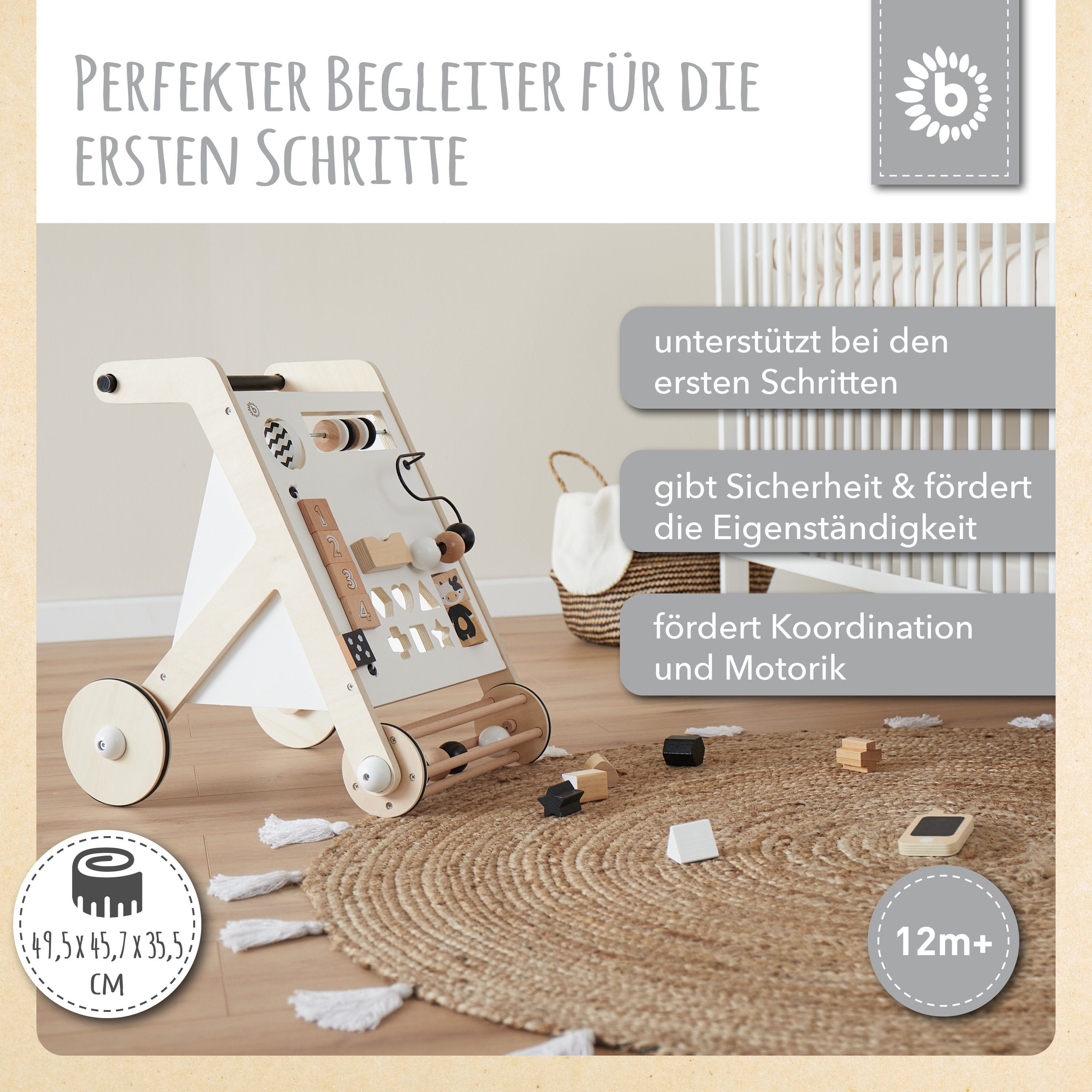 Mit diesem tollen Lauflerner von Bieco werden die ersten Gehversuche zum Kinderspiel. Mit dem schwarz-weißen Design im Scandi-Chic verzaubert der Lauflernwagen Mädchen und Jungen gleichermaßen. Die Laufhilfe ist aus hochwertig verarbeitetem Holz gefertigt und gibt deinem Kind durch die Haltestange den nötigen Halt für erste eigenständige Schritte. Durch die vielfältigen Spielmöglichkeiten bietet die Gehhilfe Baby zudem zahlreiche Optionen sich zu beschäftigen und zu lernen.