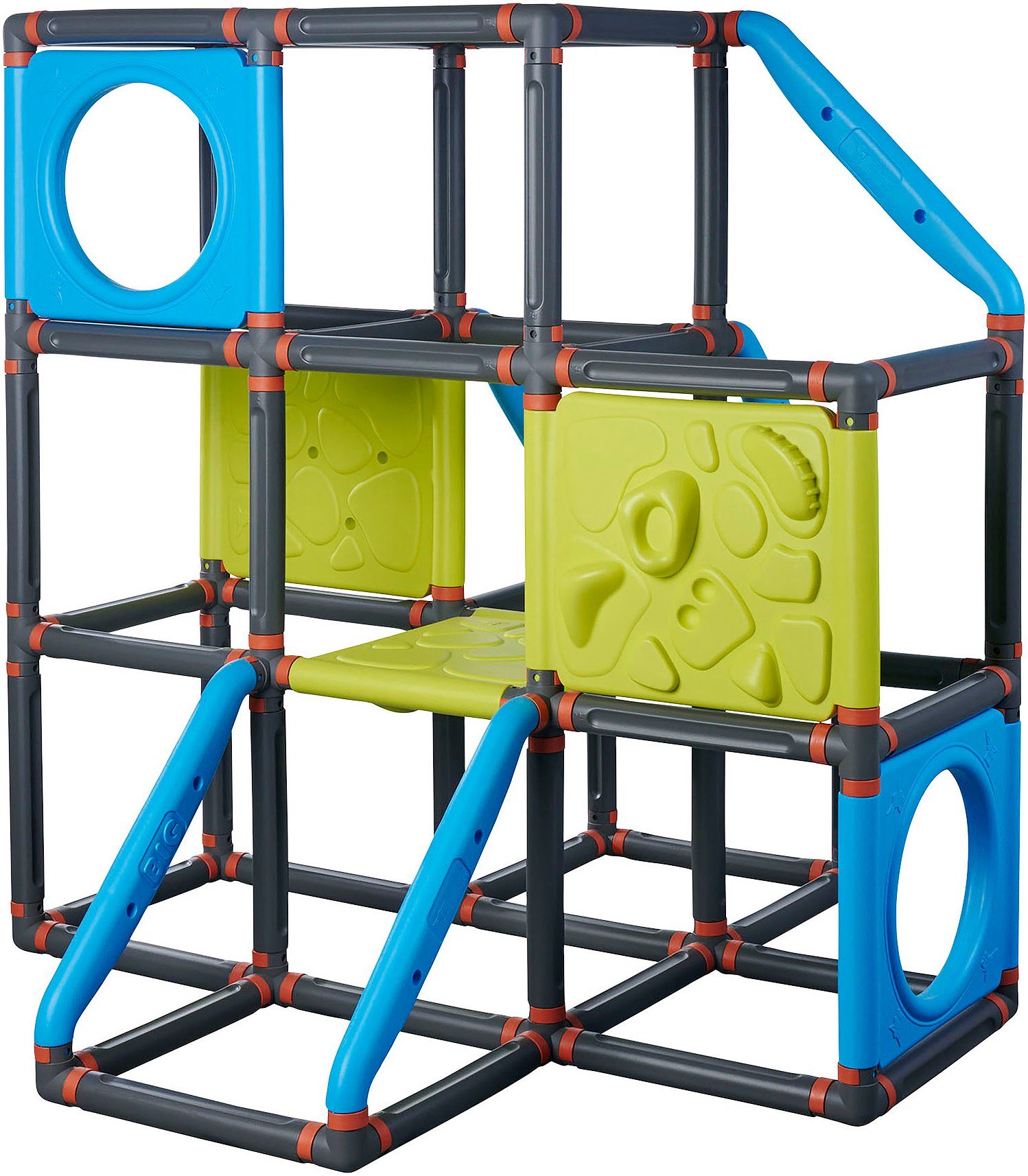 »BIG Kraxxl« - die büffelstarke hochwertige Klettergerüst-Linie von BIG. »BIG Kraxxl -The Frame« ist ein außergewöhnliches und äußerst robustes Klettergerüst, das ultimativen Spielspaß für Kinder bietet und gleichzeitig ihre körperliche Aktivität, Bewegung und Motorik fördert. Das »BIG Kraxxl - The Frame« Klettergerüst gewährleistet mit Hilfe seiner sehr stabilen und flexibel einsetzbaren geraden Stangen sowie den, auf dem Markt, einzigartigen Diagonaltraversen eine extreme Stabilität. Die im Blasverfahren produzierten Stangen ermöglichen eine Belastung des Klettergerüsts von bis zu 100 kg. Mit dem innovativen 2-Klick-System ist die Montage des Klettergerüsts einfach und schnell, ohne dass Werkzeuge benötigt werden. Gleichzeitig garantiert das System höchste Stabilität. Die sichere Verbindung der 2-Klick System Klammern kann nur on Erwachsenen geöffnet werden, um maximale Sicherheit zu gewährleisten. Zusätzliche Stabilität liefern die im Set enthaltenen U-Haken, die eine sichere Fixierung des Klettergerüsts im Boden ermöglichen. Das aufgebaute Klettergerüst ist 140 cm hoch und besteht aus 3 Etagen. Es gibt jedoch zahlreiche flexible Aufbaumöglichkeiten, so dass Размер und Anzahl der Etagen entsprechend variieren können und der Spielspaß stets spannend und abwechslungsreich gestaltet werden kann. Впередes Highlight sind die zwei enthaltenen, großen, farbigen Ringe, die das Klettergerüst zusätzlich zu einem Basketballkorb sowie Tor für Ballspiele machen. Hier können die Kinder ihre Wurf- und Schusskünste unter Beweis stellen und sportliche Herausforderungen meistern. Aber das ist noch nicht alles: Das Klettergerüst ist zudem mit drei sehr stabilen Kletterplatten mit Bouldergriffen ausgestattet, die einen sicheren Halt bieten, leicht zu greifen sind und für zusätzlichen Kletterspaß sorgen. Das wunderschöne Design des hochwertigen Klettergerüsts ist ein absolutes Highlight in jedem Garten und das wetterfeste, UV-stabilisierte Kunststoffmaterial trotzt jedem Wetter, ohne zu verblassen oder brüchig zu werden, und lässt sich leicht und hygienisch reinigen. Selbstmontage mit Aufbauanleitung