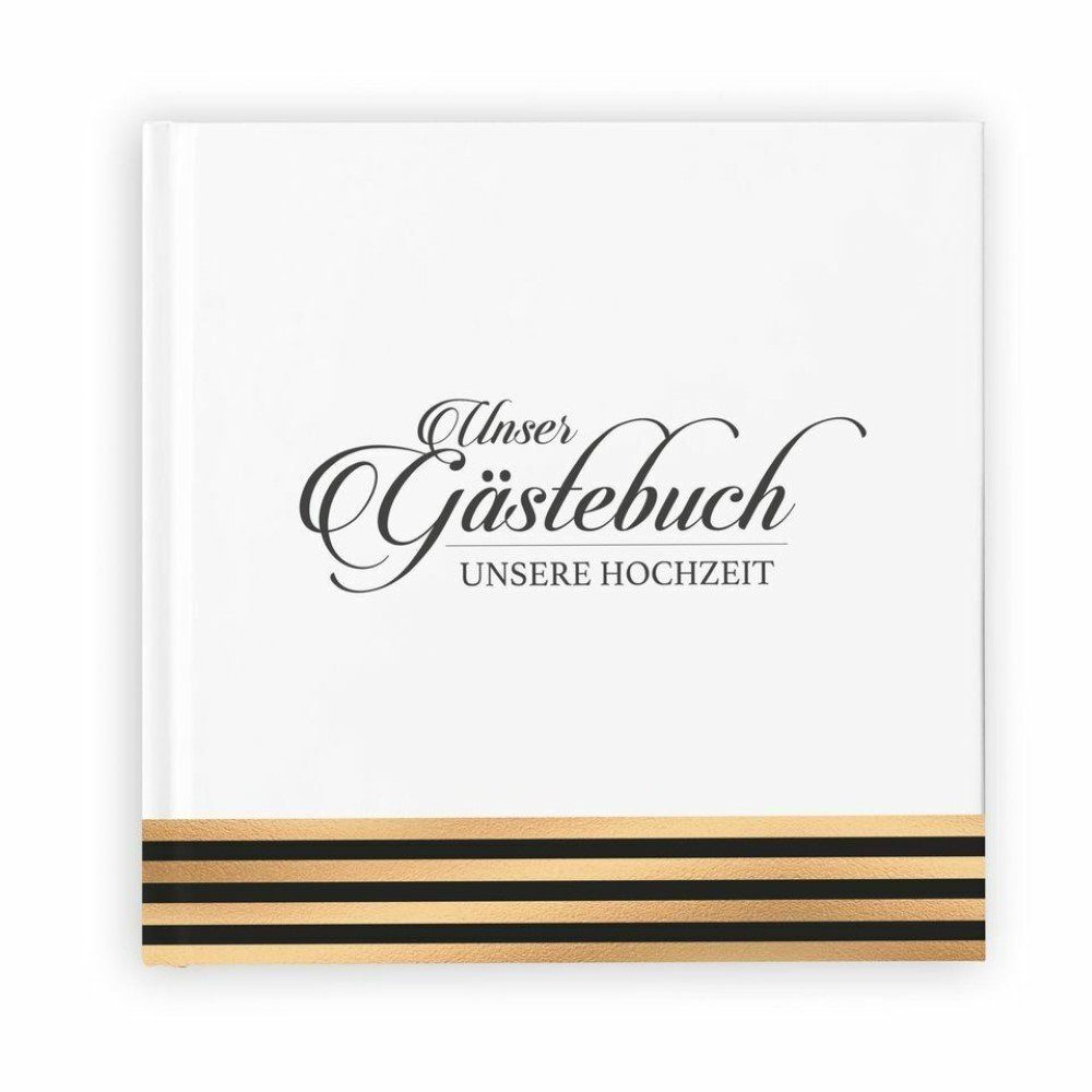 Prächtiges Quadratbuch - Goldene Erinnerungen Mit unserem Gästebuch ohne vorgegebene Fragen in quadratischem Format und elegantem Goldstreifen-Design schaffen Sie eine zeitlose Erinnerung an besondere Anlässe wie Hochzeiten, Geburtstage und mehr. Dieses Gästebuch ist ein Ort der Kreativität und Liebe, der die Gedanken und Wünsche aller Anwesenden für eine kleine Ewigkeit festhält. Mit 104 weißen Einzelseiten bietet dieses Buch ausreichend Platz für Gästebeiträge. Beschriften können Sie die Seiten mit Füllfederhaltern oder Kugelschreibern, wobei letztere etwas haltbarer sind. Das quadratische Format mit 22x22 cm macht es zu einem kompakten und handlichen Begleiter, der dennoch genügend Raum für die Einträge Ihrer Gäste bietet. Dieses Gästebuch ist nicht nur eine Sammlung von Unterschriften, sondern ein Fotoalbum und Gästebuch in einem. Ihre Gäste können sich kreativ auf den weißen Innenseiten austoben, indem sie Fotos einkleben und persönliche Botschaften hinterlassen. Einwegkameras können beim Buch ausgelegt oder vom Fotografen genutzt werden, um besondere Momente festzuhalten. Das hochwertige Hardcover aus matt-kaschiertem Material sorgt für eine langlebige und edle Optik. Die 120g Naturpapier-Innenseiten bieten genügend Stabilität für Einträge und wirken gleichzeitig hochwertig und ansprechend. Mit Platz für 100 Eintragungen der Hochzeitsgäste und einem selbst geschriebenen Einleitungstext können Sie sicher sein, dass dieses Gästebuch zu einem Schatz für viele Jahre wird. Ob als Geschenk für das Hochzeitspaar oder als kreativer Programmpunkt für die Gäste am Tag der Hochzeitsfeier - dieses Gästebuch lädt mit seinen Blankoseiten zum Ausfüllen, Zeichnen, Dichten und Wünschen ein. Dank der Produktion in Deutschland und der Verwendung lokaler Dienstleister aus NRW können Sie sich auf Qualität und Эко-товары verlassen. Schaffen Sie unvergessliche Erinnerungen und halten Sie besondere Momente für die Ewigkeit fest mit unserem Gästebuch ohne Fragen in quadratischem Format und edlem Goldstreifen-Design.