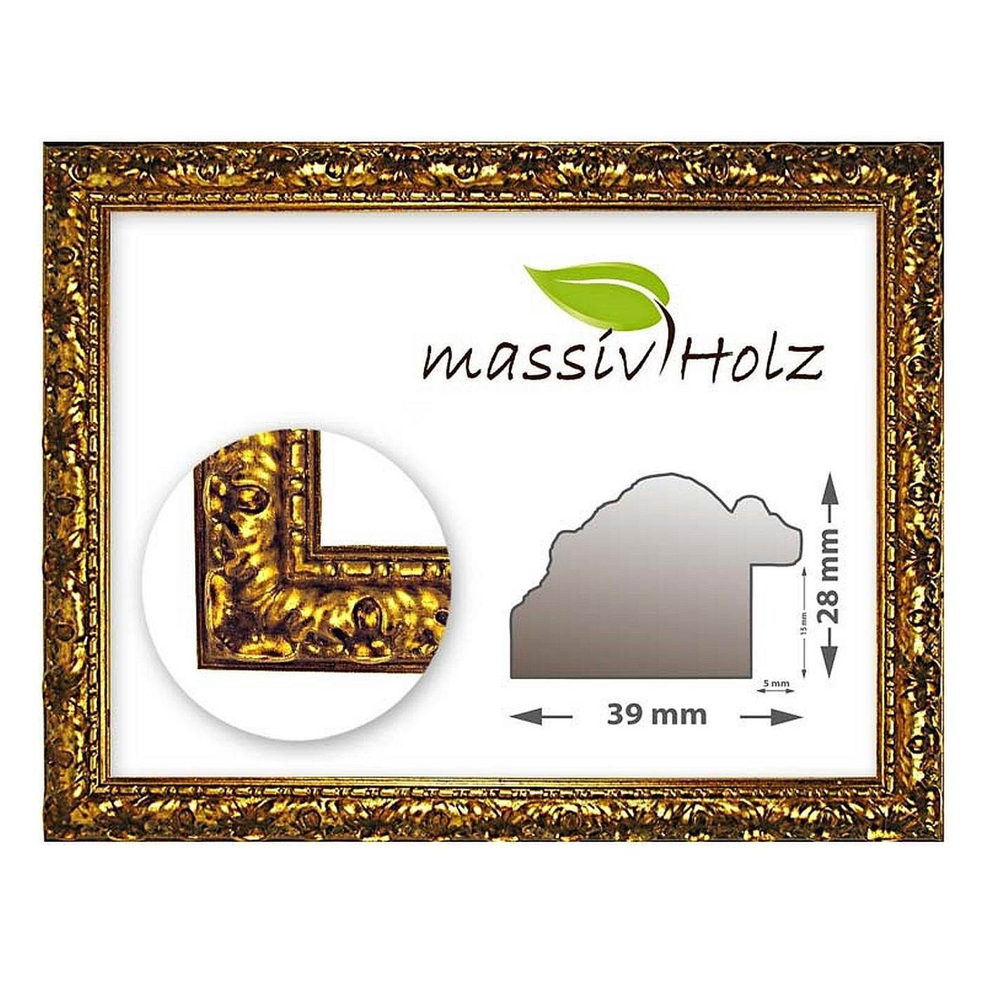 Barockrahmen 333 ORO, gold verziert, als Zuschnitt, Leerrahmen oder Wechselrahmen. Der goldene, profilierte Barockrahmen 333 ORO besitzt ein Profil von 28 mm Höhe und 39 mm Breite. Der Barockbilderrahmen wird aus massivem Holz gefertigt, kann nach Ihren Wünschen zusammengestellt und in verschiedenen Größen angefertigt werden. Der Falz der Bilderleiste ist (B x H) 5 x 15 mm groß. Auf der Bilderrahmenleiste befinden sich barocke Elemente und an der Innenkante ein Perlenband. Als Rahmen gefertigt werden zur Stabilisierung an den Ecken Metallwinkel eingearbeitet und Aufhängungen für Hoch- und Querformat angebracht. Sie können den Bilderrahmen im barocken Stil als Zuschnitt mit Gehrung, als Leerrahmen und Wechselrahmen erhalten. Zur Erläuterung: Zuschnitt: Profilleisten sind auf Gehrung geschnitten und nicht zusammengefügt. Leerrahmen: Profilleisten sind auf Gehrung geschnitten und zusammengefügt. Wechselrahmen: Profilleisten sind auf Gehrung geschnitten, zusammengefügt und werden mit Glas, Rückwand, Aufhängung und angestanztem Einlegeblatt komplettiert. Barockbilderrahmen eignen sich hervorragend im barocken Ambiente, aber auch, um mit Gegensätzen zu spielen. Zum Beispiel kann man moderne Farben, gepaart mit einem barocken Goldrahmen verwenden. Dies ergibt eine sehr interessante Kombination aus den Gegensätzen von klassisch und modern. Für Maße, die Sie hier im Shop nicht angeboten bekommen, fragen Sie uns bitte an. Wir als Hersteller können Ihnen jedes Maß liefern.