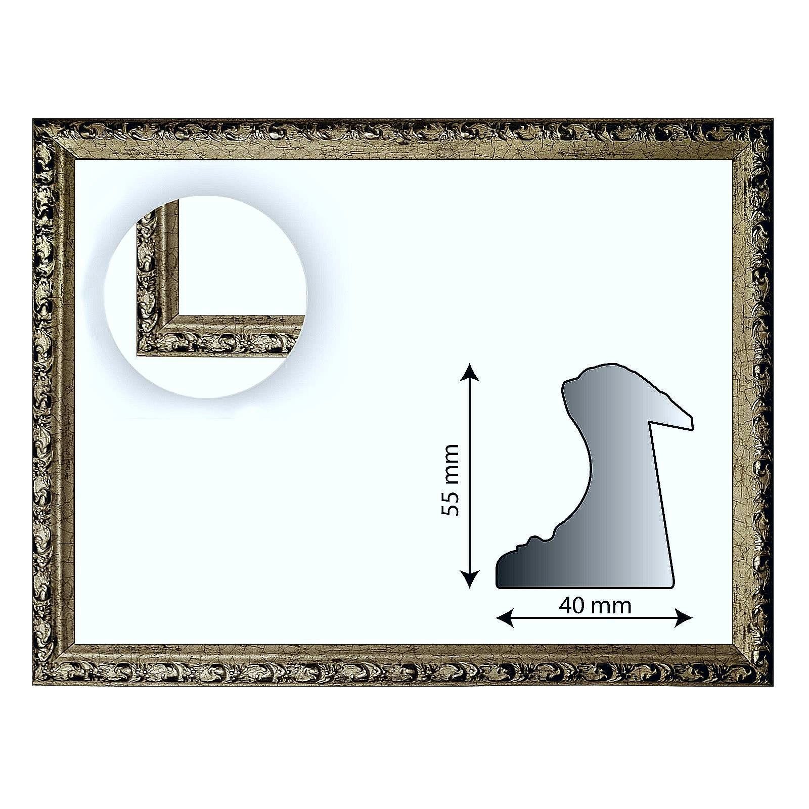 Barockrahmen 10920, PLA verziert, Serie 812, als Zuschnitt, Leerrahmen oder Wechselrahmen. Dieser platinfarbene Barockrahmen 10920 besitzt ein Profil von 55 mm Höhe und 40 mm Breite. Der Bilderrahmen im Barock-Stil ist hier als Zuschnitt mit Gehrung, als Leerrahmen und Wechselrahmen erhältlich. Als Rahmen gefertigt werden zur Stabilisierung an den Ecken Metallwinkel eingearbeitet und Aufhängungen für Hoch- und Querformat angebracht. Zur Erläuterung:- Zuschnitt: Profilleisten sind auf Gehrung geschnitten und nicht zusammengefügt - Leerrahmen: Profilleisten sind auf Gehrung geschnitten und zusammengefügt - Wechselrahmen: Profilleisten sind auf Gehrung geschnitten, zusammengefügt und werden mit Glas, Rückwand, Aufhängung und angestanztem Einlegeblatt komplettiert. Barockbilderrahmen eignen sich klassisch im barocken Ambiente, aber auch, um mit Gegensätzen zu spielen. Zum Beispiel verwendet man moderne Farben, gepaart mit einem barocken Goldrahmen. Dies ergibt eine interessante Kombination aus den Gegensätzen von klassisch und modern. Für Maße, die hier nicht angeboten werden, fragen Sie uns bitte an. Wir als Hersteller können Ihnen jedes Maß liefern.