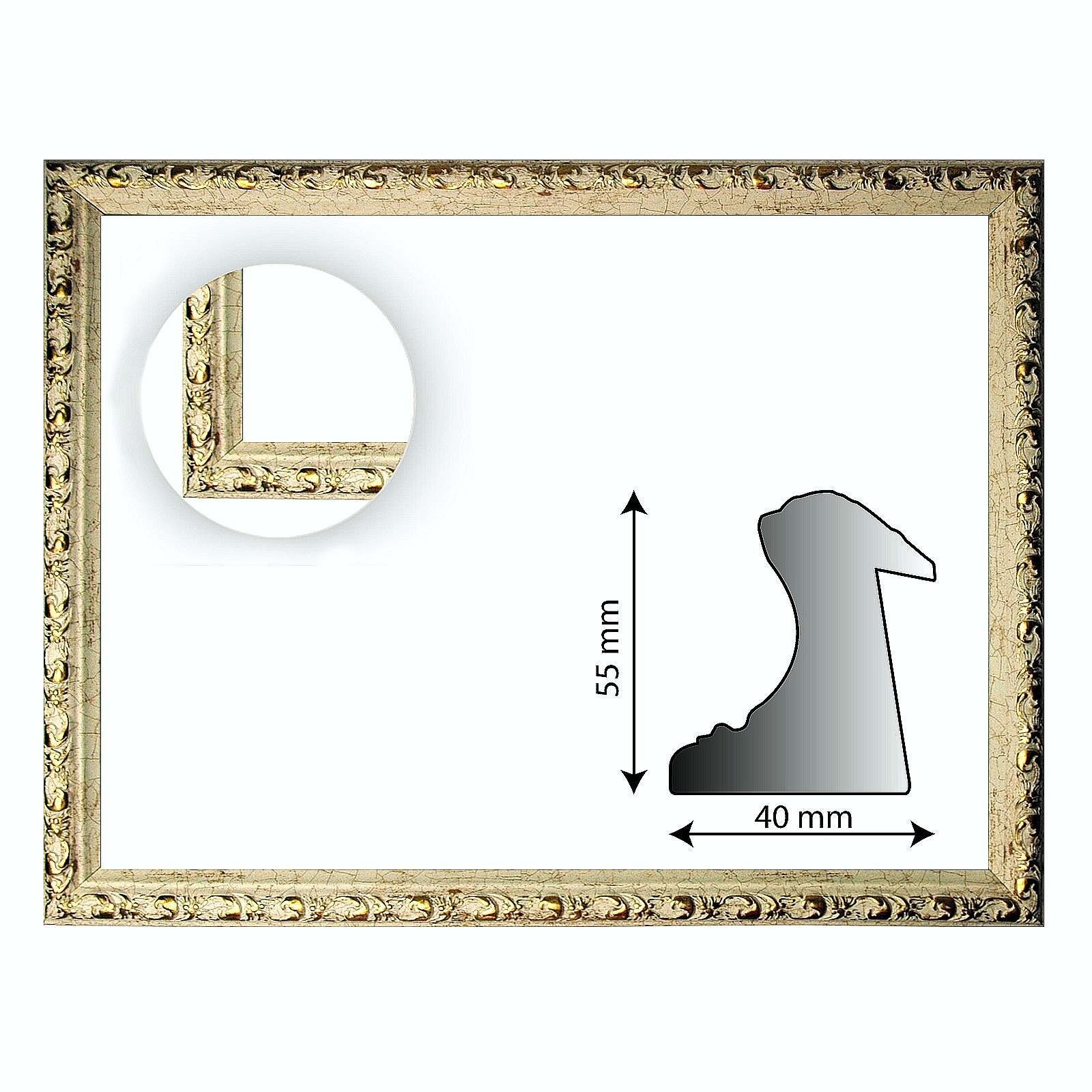 Barockrahmen 10918, AVO verziert, Serie 812, als Zuschnitt, Leerrahmen oder Wechselrahmen. Dieser weiße Barockrahmen 10918 besitzt ein Profil von 55 mm Höhe und 40 mm Breite. Der Bilderrahmen im Barock-Stil ist hier als Zuschnitt mit Gehrung, als Leerrahmen und als Wechselrahmen erhältlich. Als Rahmen gefertigt werden zur Stabilisierung an den Ecken Metallwinkel eingearbeitet und Aufhängungen für Hoch- und Querformat angebracht. Zur Erläuterung:- Zuschnitt: Profilleisten sind auf Gehrung geschnitten und nicht zusammengefügt - Leerrahmen: Profilleisten sind auf Gehrung geschnitten und zusammengefügt - Wechselrahmen: Profilleisten sind auf Gehrung geschnitten, zusammengefügt und werden mit Glas, Rückwand, Aufhängung und angestanztem Einlegeblatt komplettiert. Barockbilderrahmen eignen sich klassisch im barocken Ambiente, aber auch, um mit Gegensätzen zu spielen. Zum Beispiel verwendet man moderne Farben, gepaart mit einem barocken Goldrahmen. Dies ergibt eine interessante Kombination aus den Gegensätzen von klassisch und modern. Für Maße, die hier nicht angeboten werden, fragen Sie uns bitte an. Wir als Hersteller können Ihnen jedes Maß liefern.