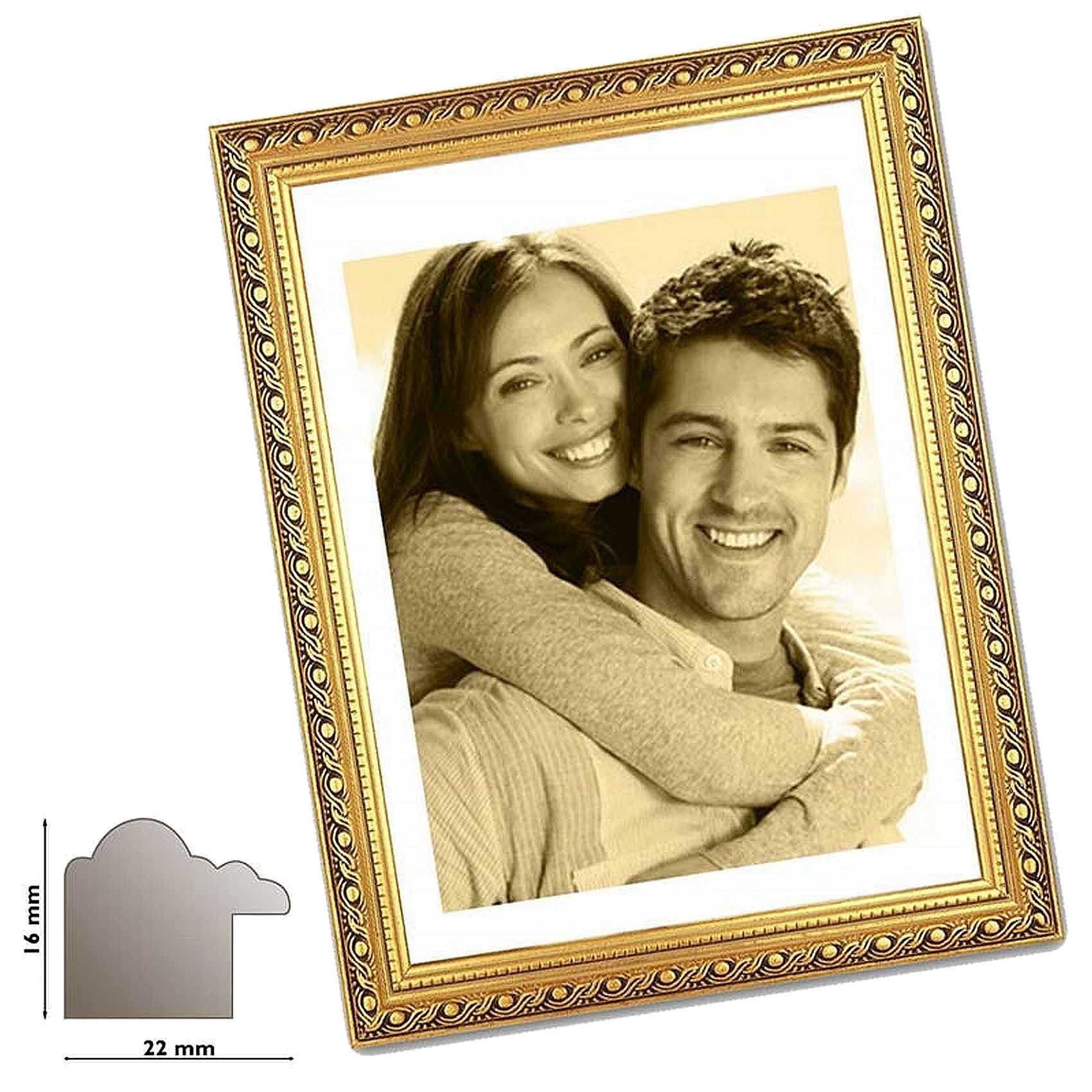 Kunststoffrahmen ANTIK, gold verziert. Den Kunstoffrahmen "Antik" erhalten Sie in verschiedenen Größen und mit Normalglas versehen. An der Rückwand befindet sich ein praktischer Drehverschluss. Das Rahmenprofil besitzt eine Höhe von 16 mm und eine Breite von 22 mm. An der Rückseite des Bilderrahmens befinden sich eine Aufhängung für Hoch- und Querformat sowie ein ausziehbarer Steller (Format 9 x 13 cm bis 18 x 24 cm). Zwischen Glas und Rückwand befindet sich ein angestanztes Einlegeblatt, welches Sie als Passepartout verwenden können. Die Bilder werden Ihnen in hoher Qualiät - Made in Germany - angeboten.