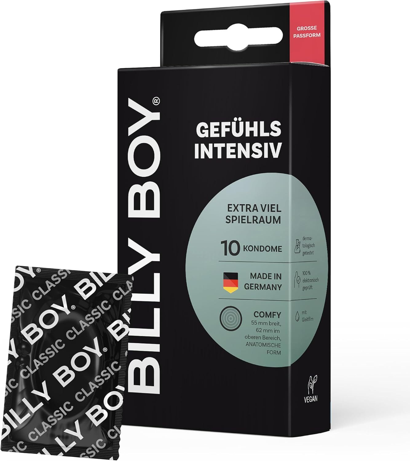 Für ein natürliches Erlebnis - der 10er Mix BILLY BOY gefühlsintensive Kondome mit der bequemen Form ist für alle, die ein besonders angenehmes Erlebnis beim Sex suchen. Die anatomisch angepasste Passform ComfY, die im oberen Bereich breiter ist als am Schaft und die glatte Oberfläche sorgen für gefühlsintensives Empfinden und natürlichen Spaß beim Sex. BILLY BOY ist für jeden da! Entdecke auch unsere unterschiedlichen Kondomgrößen und anatomischen sowie zylindrischen Passformen - von Breiter über Original bis hin zu Comfy findet jeder das Kondom, welches zu ihm passt. Wir sind da für euch - da für guten Sex und alles, was damit zusammenhängt. Wir stehen für Leichtigkeit, Vielfalt, Эко-товары und die Freiheit, eure Lust zu erkunden und so zu leben, wie ihr es möchtet. Liebt euch selbst, liebt und datet, wen oder wann oder wie ihr wollt - und gestaltet euren Sex so, wie er für euch am schönsten ist. Kondome von BILLY BOY sind dabei immer an eurer Seite und können bei richtiger Anwendung vor ungewollten Schwangerschaften und Infektionskrankheiten schützen. Kein Verhütungsmittel kann zu 100 % den Schutz vor Schwangerschaft oder Infektionskrankheiten garantieren. BILLY BOY Latex-Kondome werden in Zeven in Norddeutschland mit 100% Ökostrom hergestellt und in Kartons aus recyceltem Material verpackt. Unser Qualitätsanspruch in Verbindung mit den hohen Produktionsstandards sorgt für eure Sicherheit, damit ihr sorglos Spaß am Sex haben könnt. Jedes Kondom aus Naturkautschuklatex ist vegan. Es werden keine tierischen Inhaltsstoffe verwendet und keine Tierversuche durchgeführt. Jedes Kondom wird einzeln elektronisch geprüft. Die Kondome aus Naturkautschuklatex sind dazu sehr hautverträglich und dermatologisch getestet.