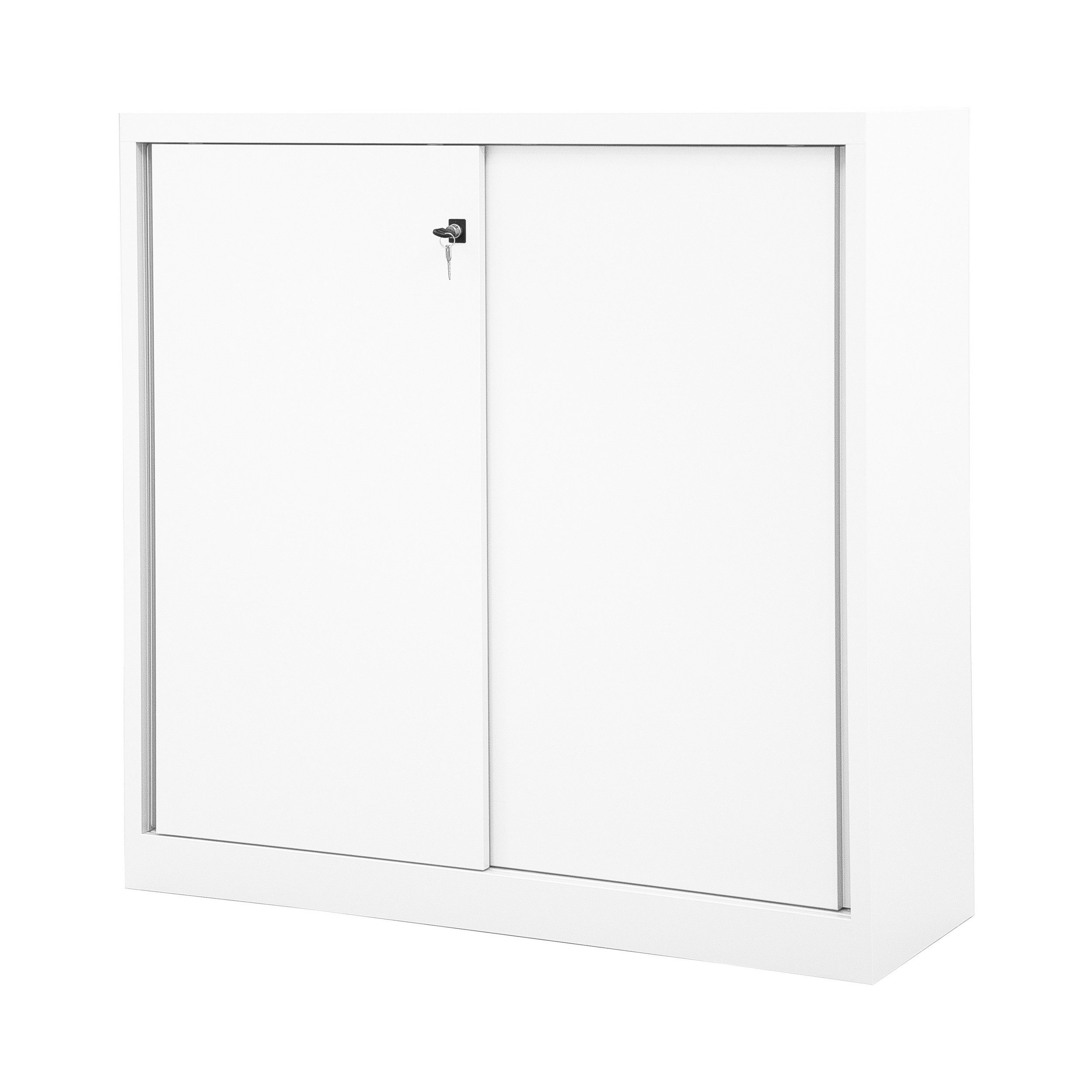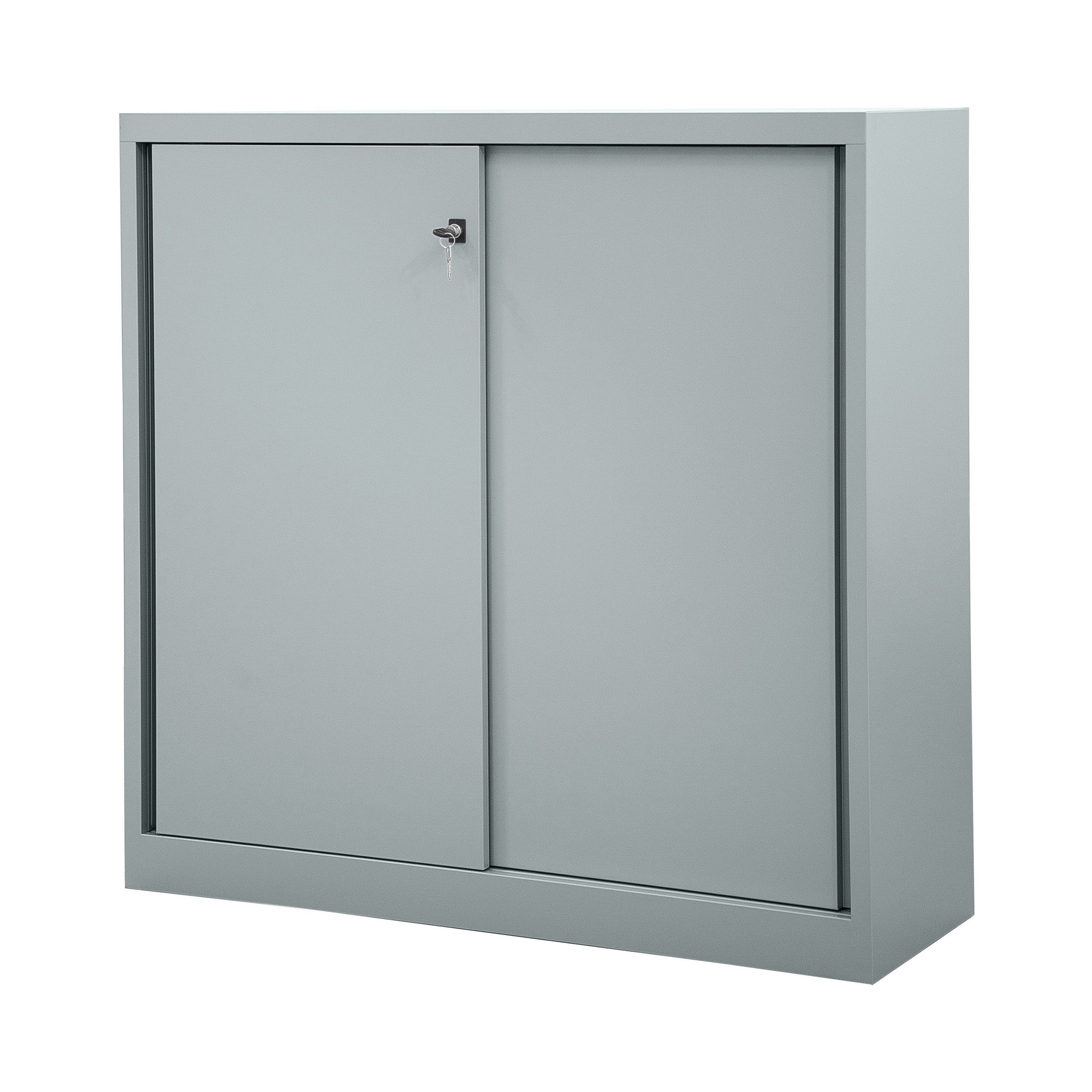 Bisleys neuer Schiebetürenschrank der Serie ECO ist mit seiner geringen Stelltiefe die perfekte preisgünstige Alternative bei kleinem Raumangebot. Die mit den Führungsschienen abschließende Bodenplatte ermöglicht ein barrierefreies Be- und Entladen. Ordner und Unterlagen verschwinden hinter den geräuscharm laufenden, abschließbaren Schiebetüren. Zwei schwarz lackierte Fachböden schaffen Ablagefläche für drei Ordnerhöhen.