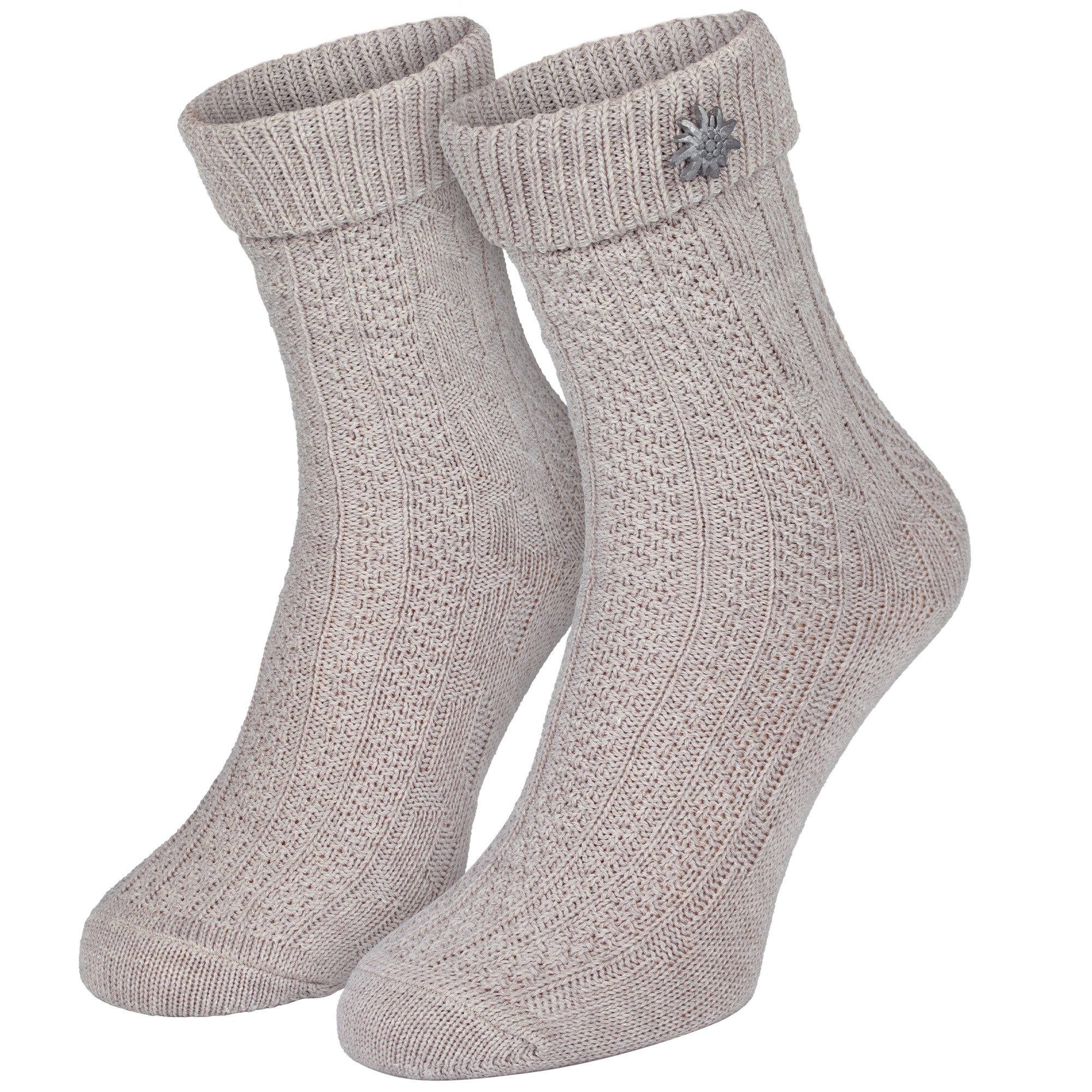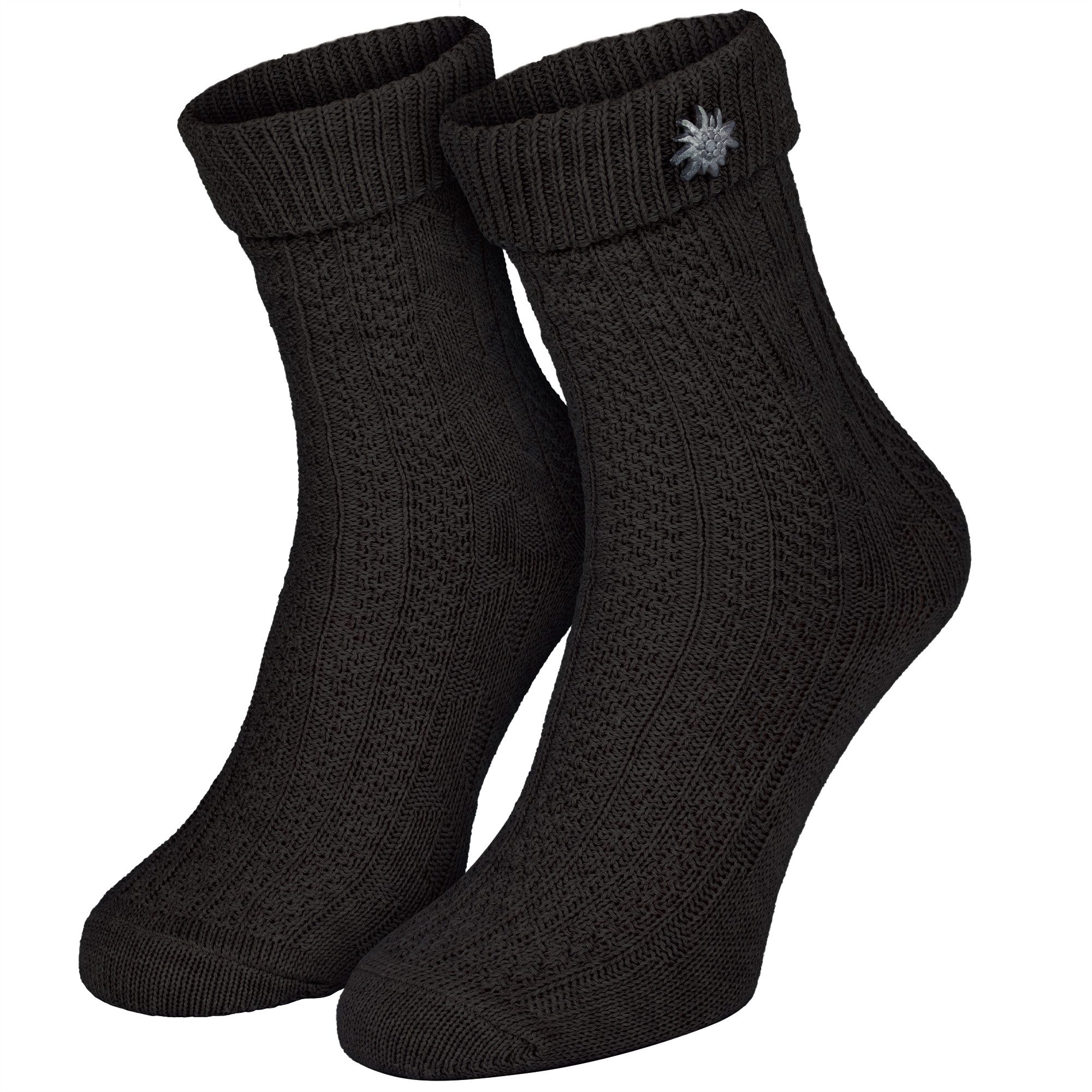 · Trachtensocken für Damen und Herren - ideal für Oktoberfest, Volksfeste & Trachtenmode · Weicher umschlagbarer Bund für festen Halt ohne Einschneiden · Abnehmbarer Edelweiß-Pin - dekorativ und vielseitig kombinierbar · Klassisches Zopfmuster im traditionellen Strickstil · Hautfreundlicher Baumwollmix für hohen Tragekomfort und gute Passform · Handgekettelte Ferse und Spitze - keine drückenden Nähte · Material: 80% Baumwolle, 15% Polyamid, 5% Elasthan