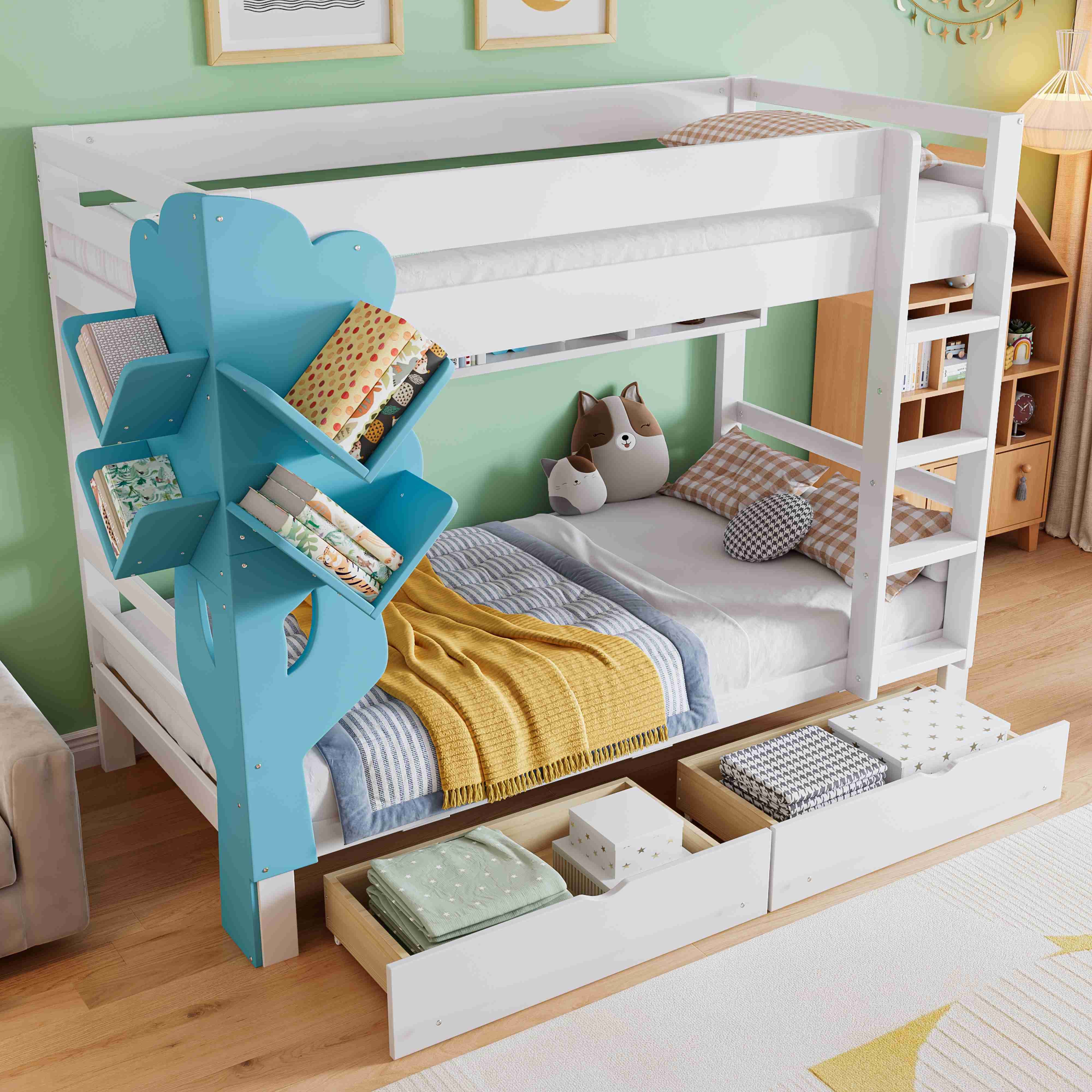 Bücherregal in Baumform: Das kreative Regal unter dem Etagenbett in Form eines Baumes bietet zusätzlichen Stauraum für Bücher, Spielzeug und andere Dinge.