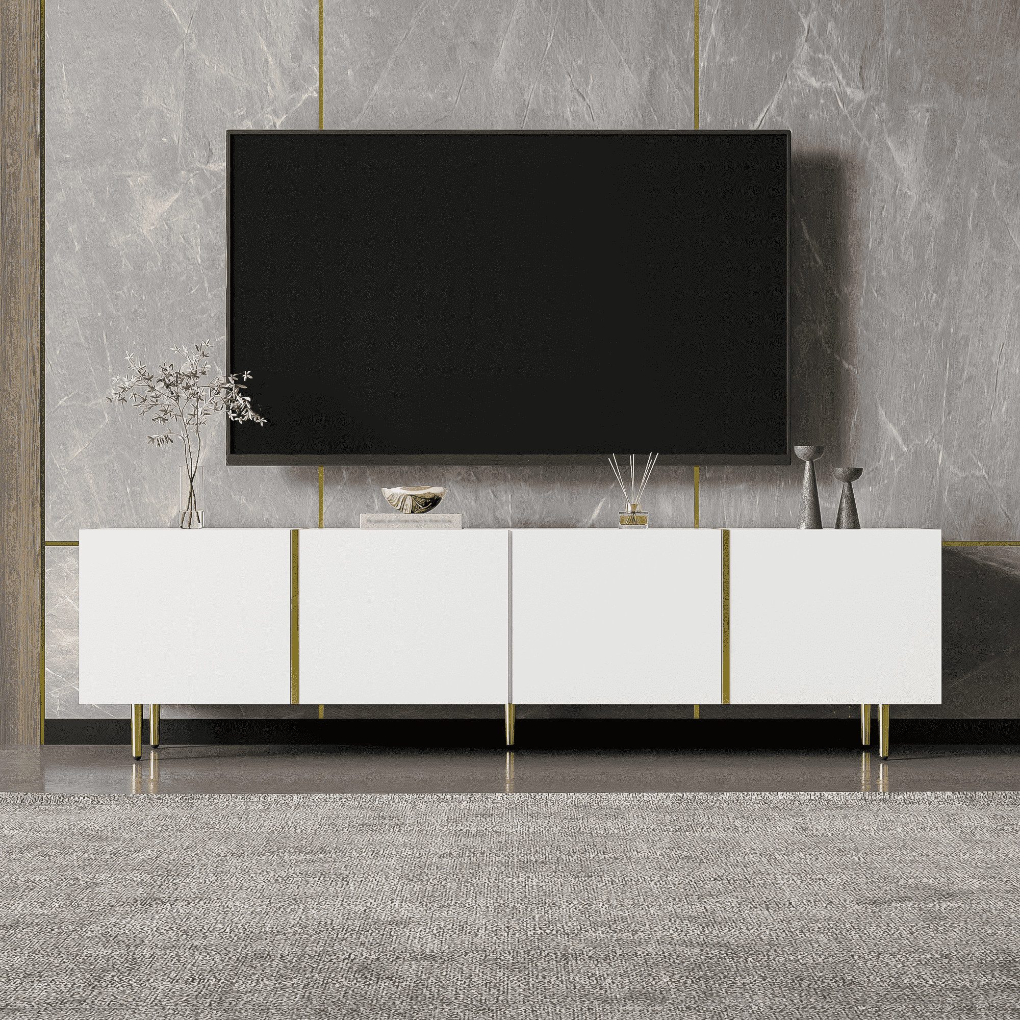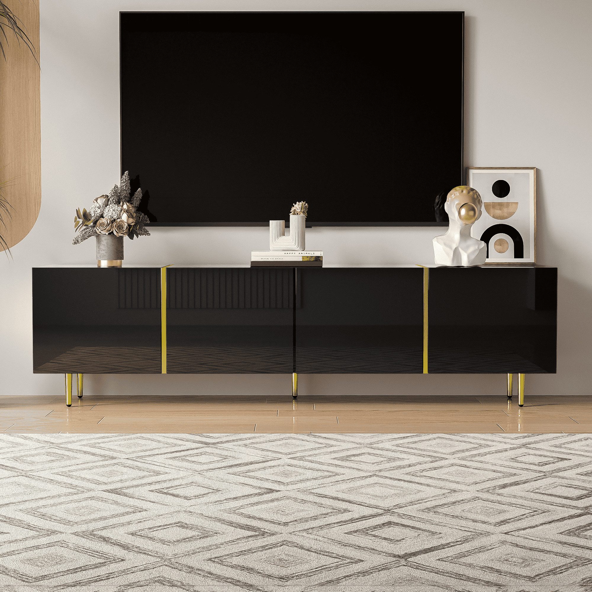☑ Dieses stilvolle schwarze Hochglanz-TV-Schrank vereint Funktionalität und modernes Design perfekt. Mit den Maßen 170 cm (L) x 35 cm (B) x 46 cm (H) bietet es vier geräumige Türen, die ausreichend Stauraum für Bücher, Fernbedienungen und andere Wohnzimmerutensilien bieten. Die glänzende schwarze Oberfläche in Kombination mit eleganten Goldakzenten schafft ein edles und zeitloses Erscheinungsbild, das sich mühelos in jede Raumgestaltung einfügt und Ihrem Wohnraum einen Hauch von Eleganz verleiht. Die Hochglanzoberfläche ist nicht nur optisch ansprechend, sondern auch leicht zu reinigen und zu pflegen. Ausgestattet mit Soft-Close-Scharniere lassen sich die Türen leise und sanft schließen, was Ihre Benutzererfahrung deutlich verbessert. Dieses durchdachte Design reduziert Lärm und Abnutzung, wodurch die Lebensdauer des Produkts verlängert wird. Dank der detaillierten Anleitung ist der TV-Schrank einfach zu montieren, sodass Sie ihn schnell und unkompliziert aufstellen können. (Hinweis: Die Hochglanzoberfläche ist mit einer Schutzfolie versehen, die vor Gebrauch entfernt werden sollte.)