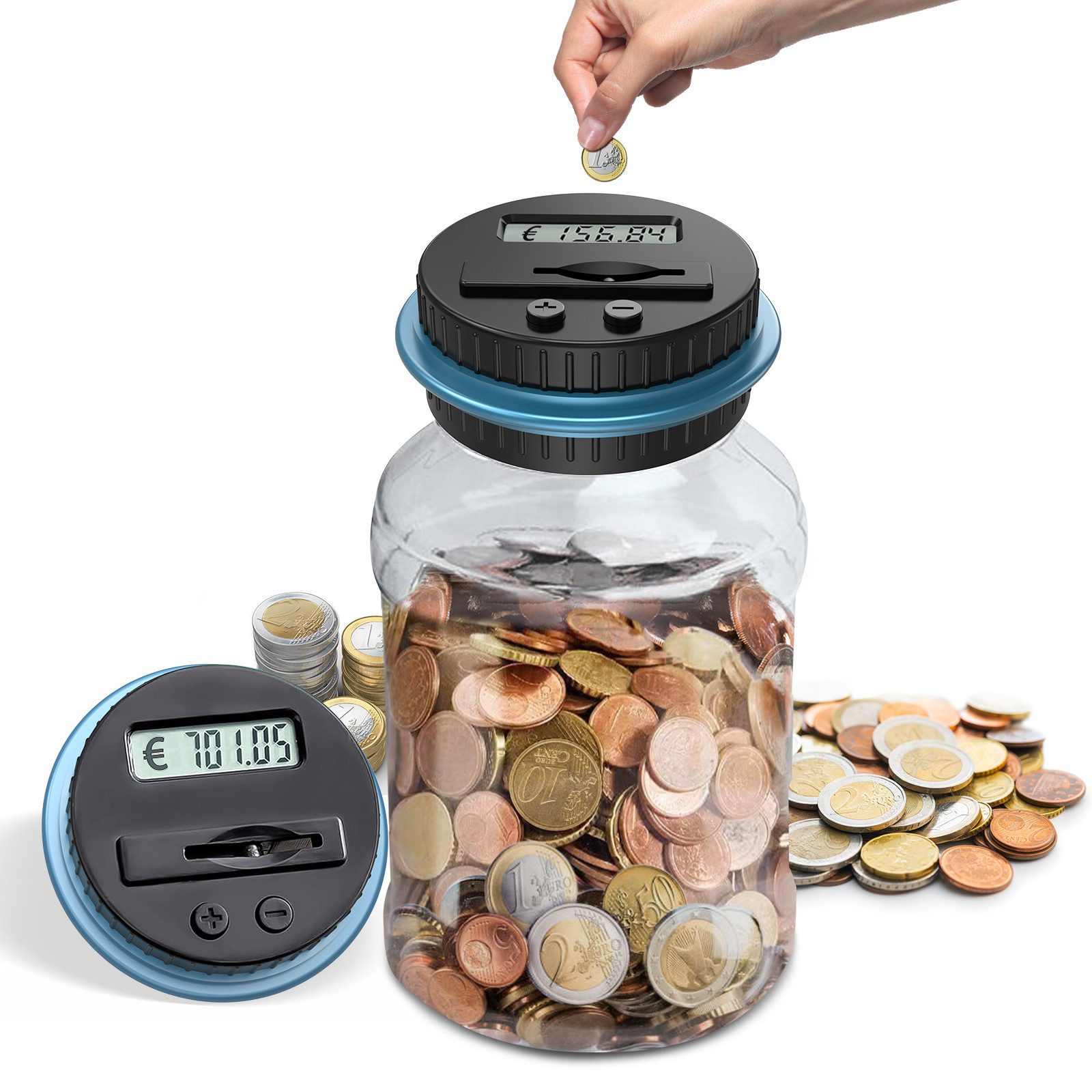 Dieses durchsichtige Glas verfügt über einen LCD-Bildschirm auf einem Deckel, der mit einer 2 * AAA 1,5 V-Batterie (nicht im Lieferumfang enthalten) betrieben wird. Sie hilft beim Zählen Ihrer Münzen, wenn diese durch den Schlitz gleiten. Es zählt Ihr Geld genau und zeigt den Gesamtbetrag für jede Einzahlung an.