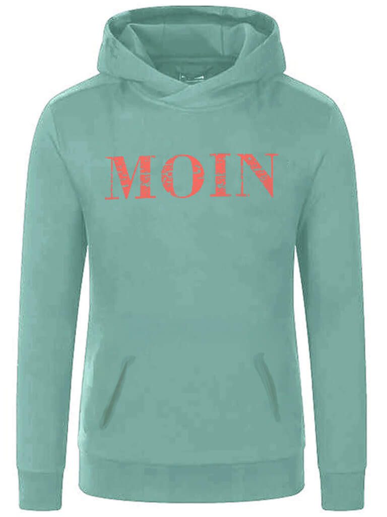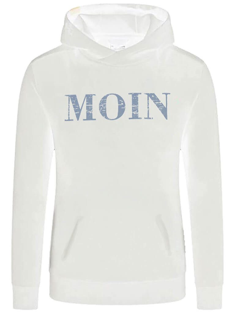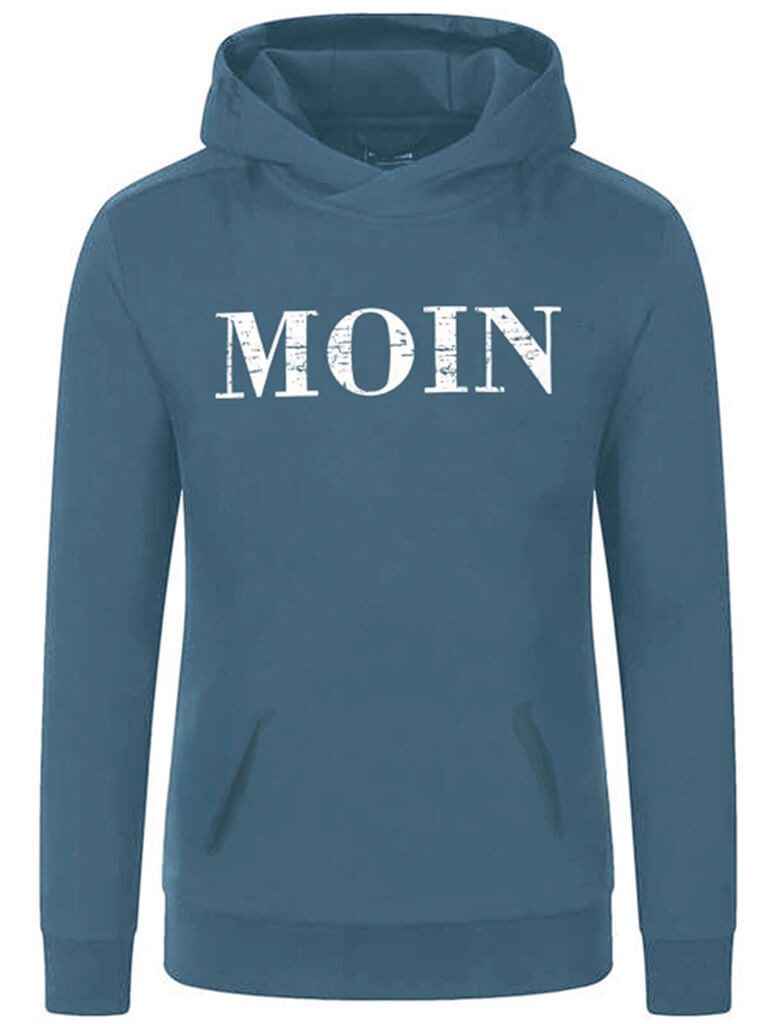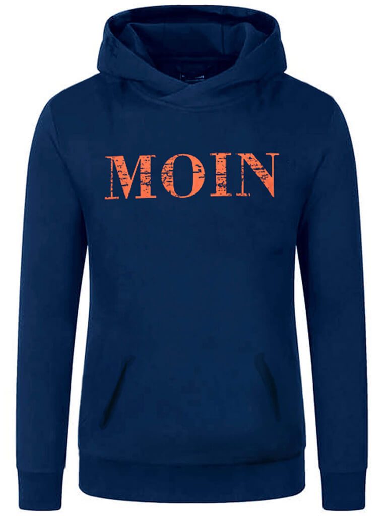Der gerade Schnitt des Pullovers bietet eine entspannte Passform, die zu jeder Figur passt. Der prägnante Brustdruck „MOIN“ setzt ein cooles, nordisches Statement und macht den Sweathoody zum echten Hingucker. Die klassische Kapuze mit Kängurutasche verleiht dem Pulli einen sportlich-modernen Look. Gefertigt aus 300 g/m² erstklassigem Material, überzeugt dieser Sweathoody durch seine angenehme Haptik und Strapazierfähigkeit. Die Rippbündchen an Ärmeln und Saum sorgen für einen perfekten Sitz und zusätzliche Wärme an kühlen Tagen. Dieser Hoodie bietet einen angenehmen Tragekomfort, der ihn zur idealen Wahl für entspannte Tage zu Hause, sportliche Aktivitäten oder Ausflüge in der Stadt macht. Der weiche Stoff liegt sanft auf der Haut, während die praktische Kängurutasche ausreichend Platz für die wichtigsten Kleinigkeiten bietet.