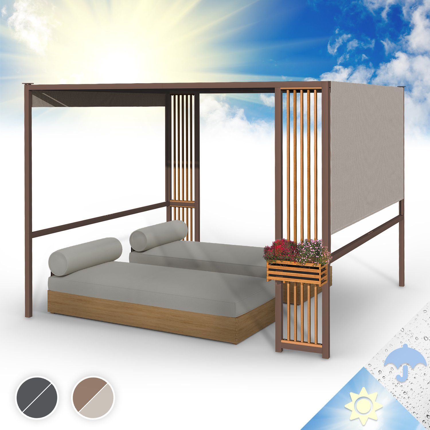 Unter dem Dach des eleganten Gazebo Valence von blumfeldt kannst du mit Familie oder Freunden jedes Wetter genießen - das hochwertig beschichtete Material bietet dir Schutz vor UV-Strahlen und Regen. Ob auf der Terrasse oder im Garten, erlebe hier einen komfortablen Schattenplatz, der zeitgleich ein wundervoll dekorativer Hingucker ist. Edle Streben aus Holz bilden die Seitenwände und sind perfekt geeignet, prachtvoll bepflanzte Blumentöpfe anzubringen. So wird der exklusive Gartenpavillon Valence von blumfeldt zu einer sommerlichen Oase, welche abends durch das stimmungsvolle LED-Licht gut beleuchtet wird. Die Beleuchtung wird einzig über Sonnenlicht mit 5 Watt durch das externe Solar-Panel mit Akku betrieben. Der witterungsbeständige Rahmen schenkt dir lange Freude an deiner Garten-Oase und sorgt zudem für einen festen Stand.