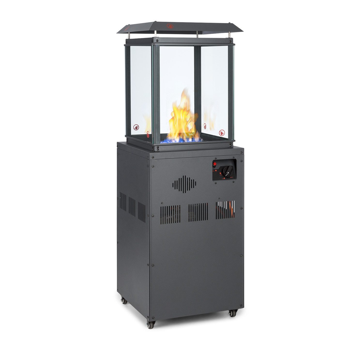 Leistungsstark und energieeffizient. Der blumfeldt Flagranti Gasheizstrahler ist zur Verwendung mit Propan- oder Butangefüllten Flüssiggasflaschen mit 5 oder 11 kg geeignet, die ganz einfach im geräumigen Innenraum Platz finden. Entfacht wird das Gerät unkompliziert über das integrierte elektrische Zündsystem. Mit einem mehrstufigen Regler wird die Zufuhr des Gases reguliert. Die Gasheizung erzeugt bis zu 8 kW Heizleistung und versorgt den Aufstellort sowie die Personen im näheren Umkreis schnell und effektiv mit angenehm wohliger Wärme. Im Mittelpunkt steht natürlich die ansehnliche Flamme, die durch 4 große Sichtfenster aus gehärtetem Glas zu sehen ist und umrandet von einer stilvollen Steindekoration für ein beeindruckendes und ungefährliches Schauspiel sorgt. Vier Bodenrollen erleichtern das Versetzen des blumfeldt Flagranti Gasheizstrahlers, während zuverlässige Feststellbremsen jederzeit den sicheren Stand der Konstruktion garantieren. Die korrosionsbeständige Bauweise aus Edelstahl macht das Gerät besonders langlebig und für die Aufstellung in Außenbereichen geeignet. Eine integrierte Sicherung unterbricht die Gaszufuhr zum Brenner falls dieser zu Kippen droht. So ausgerüstet erweitert er die Freiluftsaison um ein paar weitere Monate mit behaglichem Klima.