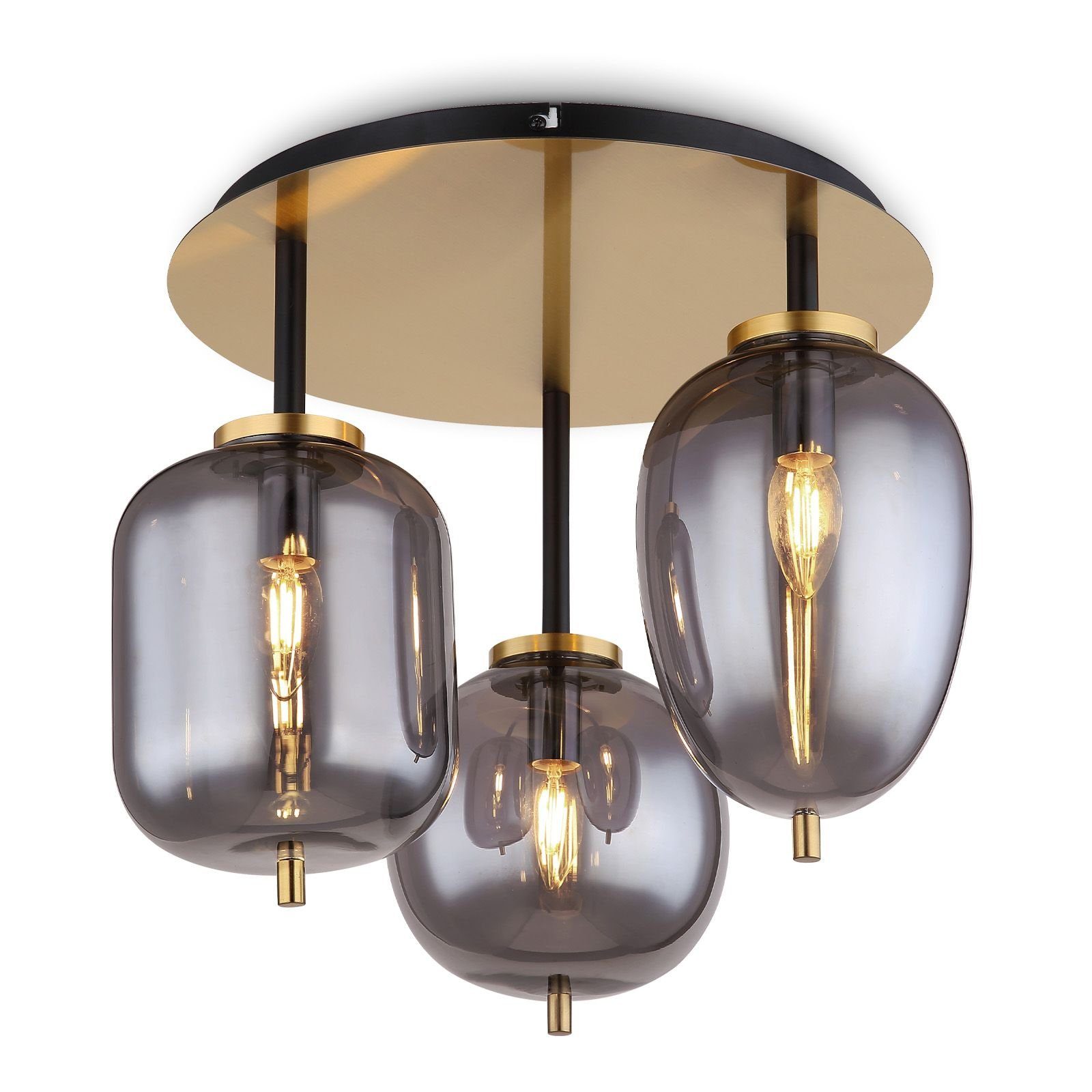 Die Deckenleuchte überzeugt mit einem ansprechenden Design. Drei E14-Fassungen sind unter individuell geformten rauchfarbenen Glasschirmen angeordnet, die an mesingfarbenem matten Stangen an einem Sockel (Ø46 cm) hängen und für eine moderne Optik sorgen. Die E14-Fassungen erlauben die Verwendung von Leuchtmitteln bis zu 40 Watt, bieten also vielseitige Beleuchtungsmöglichkeiten.
